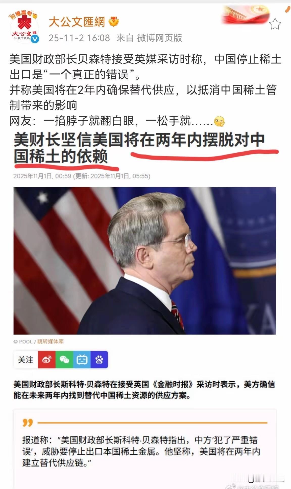 美国商务部长贝特尼克因为对中国的关税搞砸了,让特郎普训斥一顿后被冷落了,现在只剩下贝嫂一人在喋喋不休,都快成祥林嫂了,一边见人就说中国稀土卡脖子,一边又威胁说中国管制稀土是一个巨大的错误,并说美国两年内将摆脱对中国稀土的依赖,这贝嫂是生活在另一个美国吗?2010年奥巴马总统就制定了稀土与关键材料复兴法案,贝嫂难道没听说过,怎么能说美国一直在睡大觉呢?它可能真的是活在另一个美国,再说贝嫂只是一个财政部长,能不能干两年都难说,当年作为总统的奥巴马都没干成的事,你一个财政部长更不行,吹牛拍马要有度,不然很快就会跟贝特尼克一样了