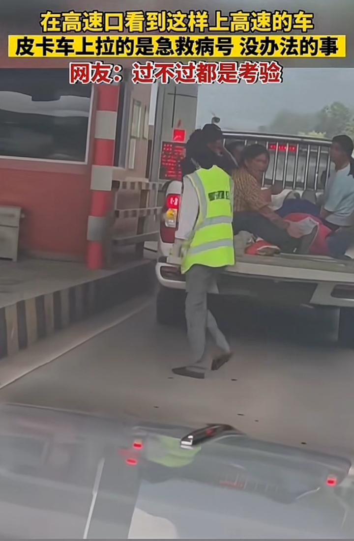 两难啊四川一高速收费站路口一辆皮卡拉着3名人员,其中还有一名病号躺在车厢内,情况着实有些严重,可收费站人员看他们如此操作放行自己背锅,不放行耽误救援真的是左右为难。 其实这种情况在司机,和其它人员关系不大,收费站人员心里想放你可她不能说,遇到这种情况要随即应变,如果执法人员站在你的车前就是不允许通过,如果他溜一圈绕到后面嘴里碎碎念,没有拦你的实质性动作,就是潜移默化的放行,这时候就一脚油门先把病人送到医院再说,就算是日后被处理也情有可原,最起码你的家人会接受你的鲁莽,事情没有绝对的对错,相对而言必有可理解的难处,针对这种情况是闯过去还是守规矩,就像人生的选择一样,怎么选都有遗憾,那么我就做对家人最有利的选择,其它规矩随它去吧!