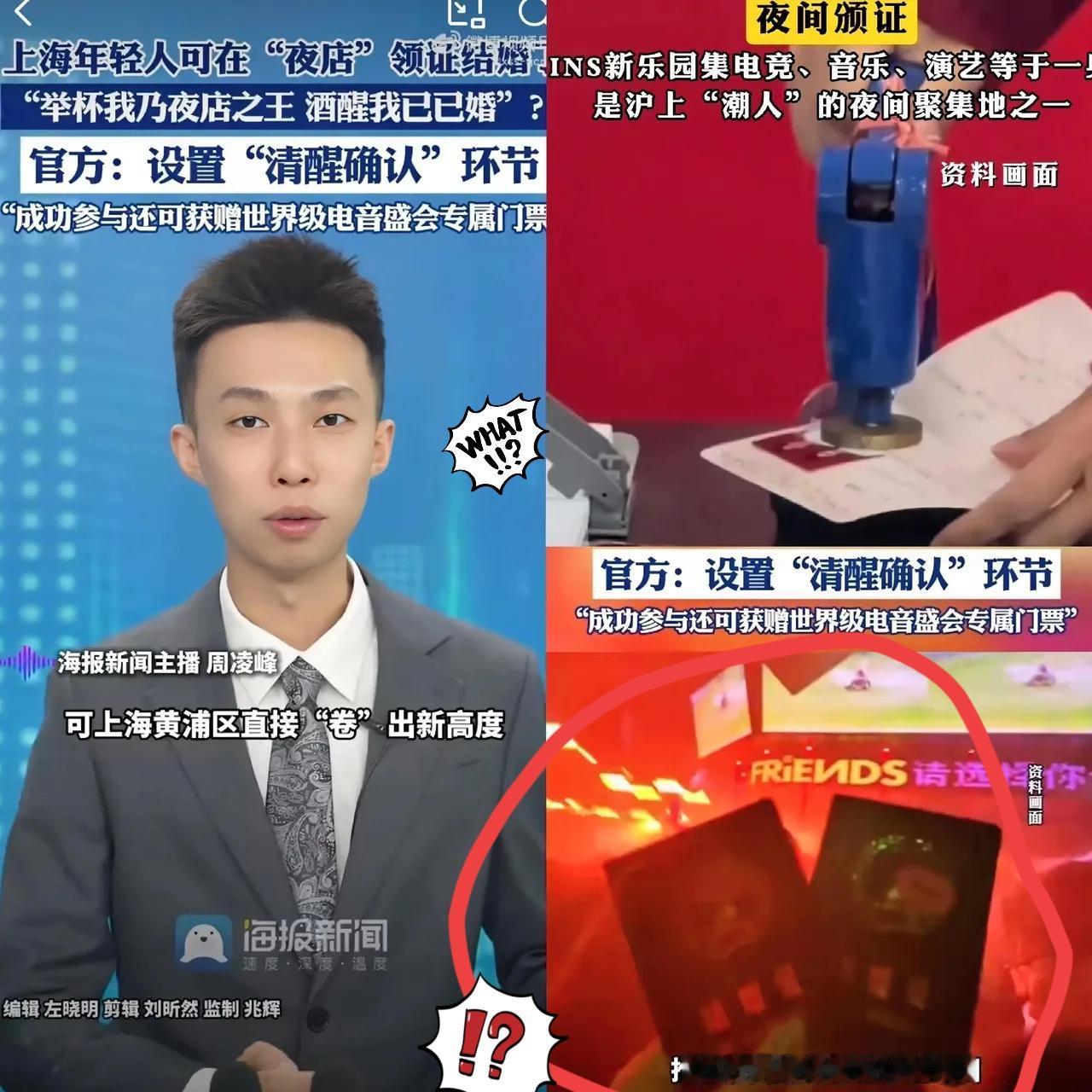 别瞎传了! 上海夜店根本不能领证, 这波误会真把人看懵了!但说真的,哪怕是误会,也戳中了大家对婚姻的纠结点。 真相是黄浦区民政局搞的夜间颁证活动,领证还得去正经民政局, 夜店只是给领完证的新人办仪式,顶多能现场预约登记, 还得确认双方清醒才行 。说白了就是把严肃的仪式变时髦了, 还送音乐节门票,挺懂年轻人喜好。 其实这事儿哪是让婚姻变随意?反而看出现在对婚姻的两种态度:既想仪式有新意, 又怕少了严肃性。年轻人不是抗拒结婚,是反感走形式,要是能把仪式感和庄重感平衡好,谁不乐意? 你觉得这种新潮颁证方式靠谱吗?要是结婚,你更想要传统仪式还是这种个性体验?