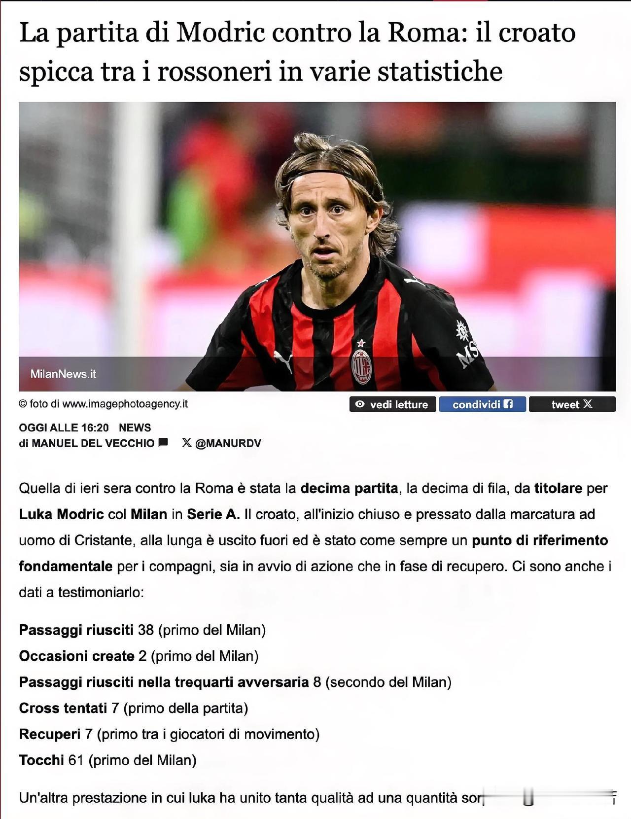 疲惫的莫德里奇依然是意甲第一!米兰与罗马之战是卢卡·莫德里奇在意甲代表AC米兰连续首发的第十场比赛。在过去的十场比赛中莫德里奇在组织进攻和防守回收中起到了至关重要的作用。只要看了米兰的比赛,就能理解阿莱格里的选择,很明显莫德里奇处理球能力比其他人高几档,看着真是享受,不过米兰球迷期待的是我们多享受几个赛季,现在这样啃,很可能明年莫德里奇就要退役了。 数据也证明了这一点: 成功传球38次(全队第一) 制造机会2次(全队第一) 在对方前场三区成功传球8次(全队第二) 尝试传中7次(全场最多) 抢断7次(所有非门将球员中最多) 触球61次(全队第一) 堂堂金球先生变成了米兰的牛马,之前几轮就有很多皇家马德里球迷对米兰俱乐部表达了不满,皇家马德里俱乐部球迷认为米兰俱乐部在犯罪,他们把球队核心用成了工兵。个人觉得皇家马德里俱乐部球迷说的没错,单线作战连续的使用,其实说明米兰整体能力不够,老头不拼到最后拿不下比赛。