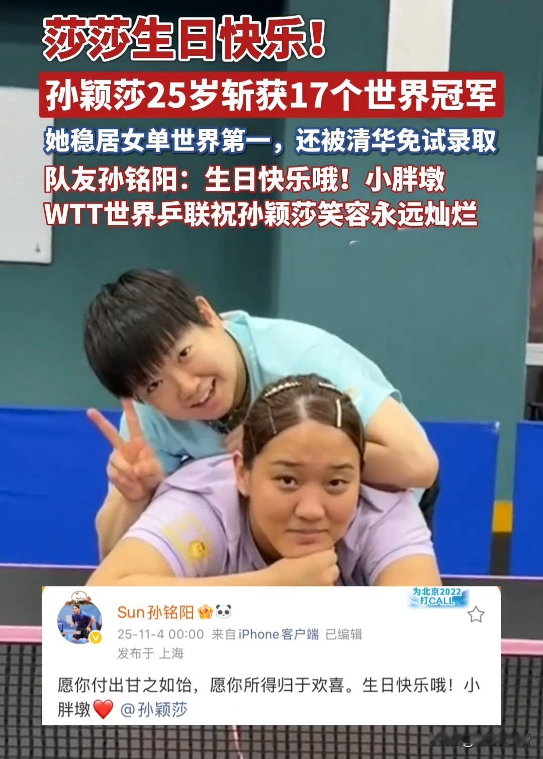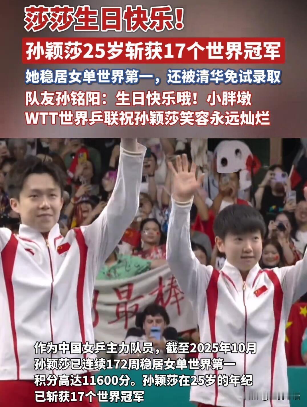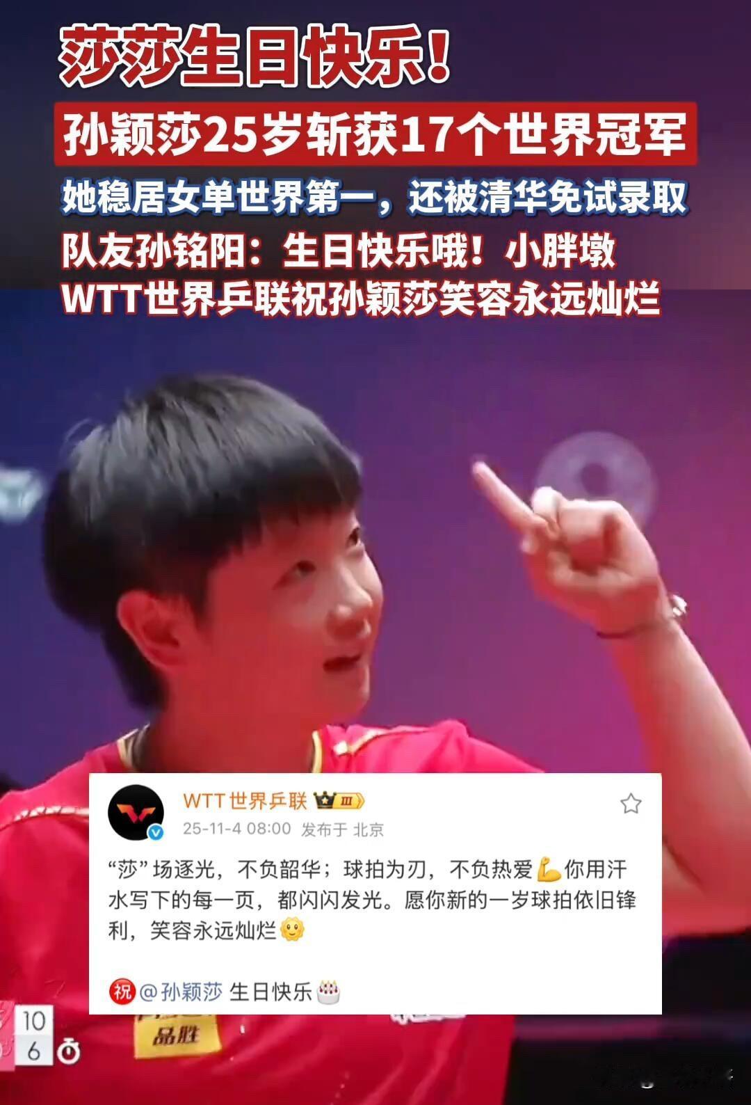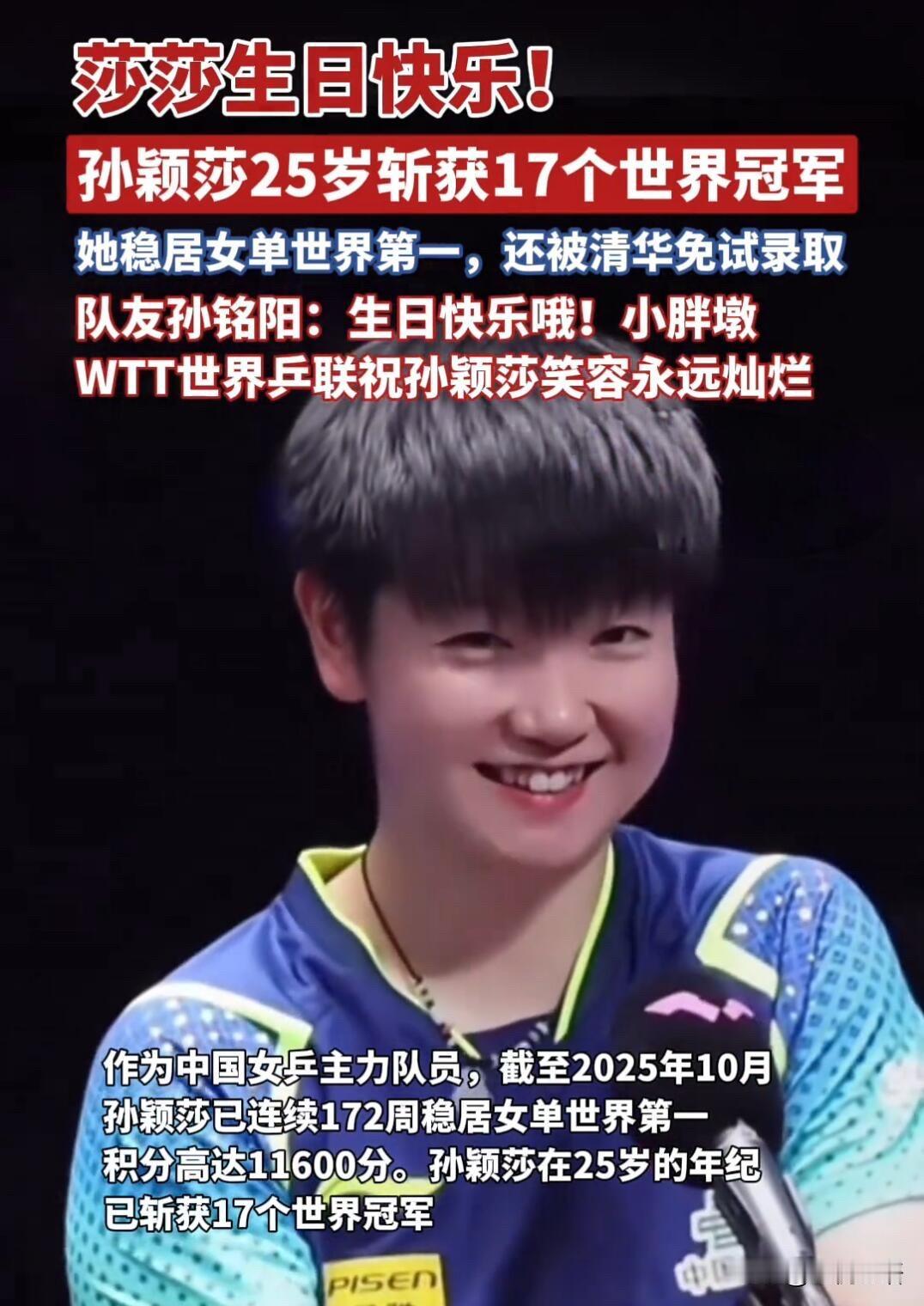 25岁孙颖莎生日赢麻了! 事业学业双巅峰!! 11月4日, 国乒小魔王孙颖莎25岁生日! 这份生日礼,简直圆满到尖叫! 赛场上,她是妥妥的大魔王! 连续172周世界第一, 积分断层领先。 25岁就拿17个世界冠军, 双圈金满贯在手! 硬仗打得干脆利落,发言清醒又霸气。 赛场外,直接变身清华硕士! 免试录取,和王曼昱成同学,太优秀! 生日祝福更是暖到心巴! 队友喊“小胖墩”超亲昵, WTT发文送祝福。 网友刷屏送贺,143万点赞零负面! 赛场上是卷王,私下里反差萌拉满。 又强又可爱,这样的莎莎谁能不爱? 新一岁,继续闪闪发光呀! 孙颖莎 球星孙颖莎