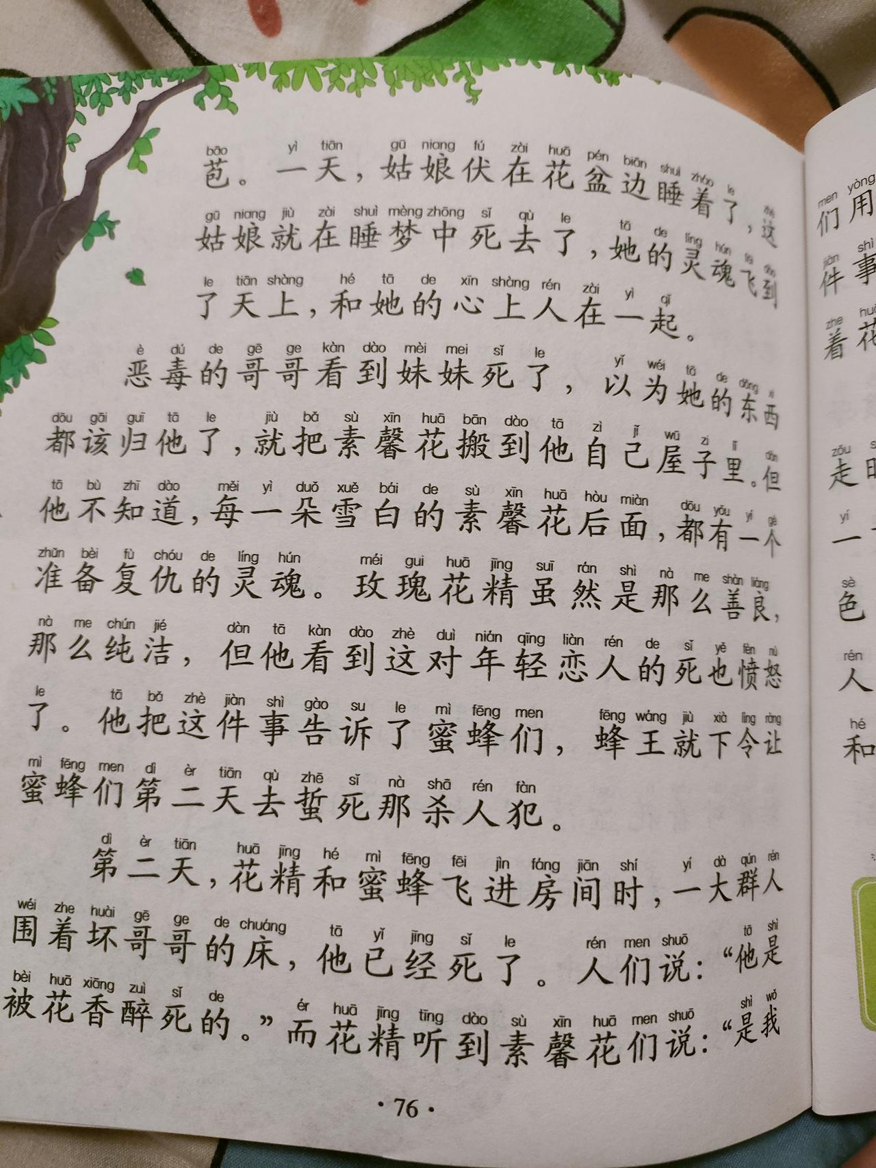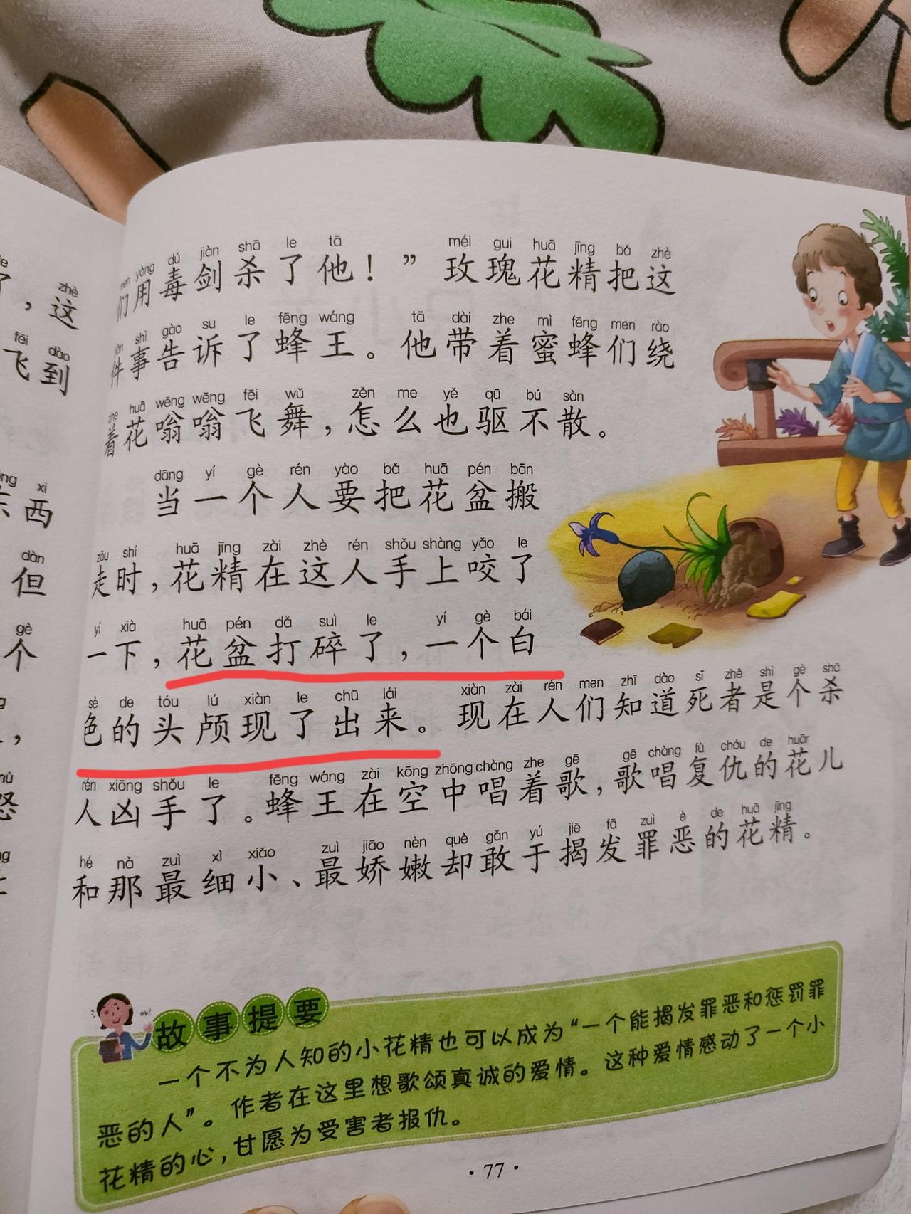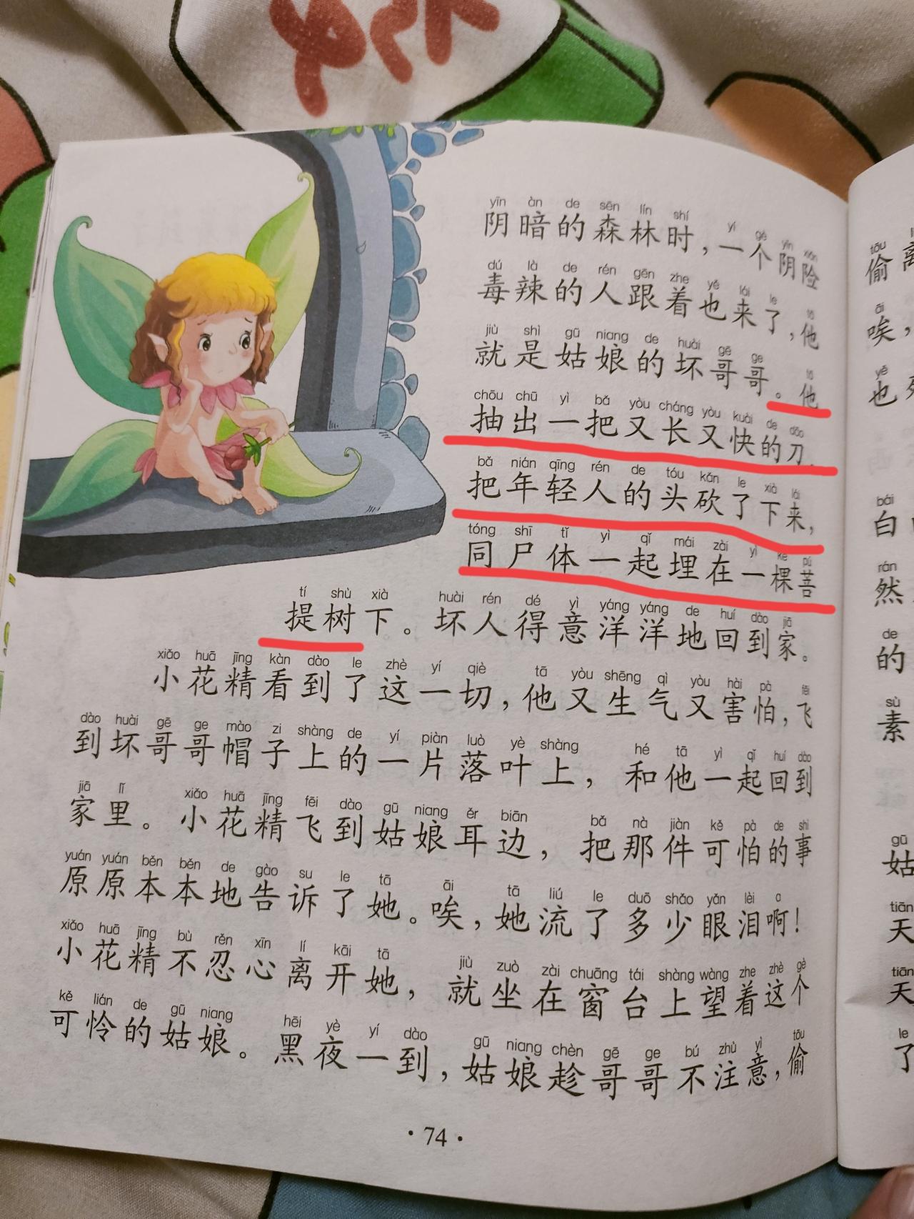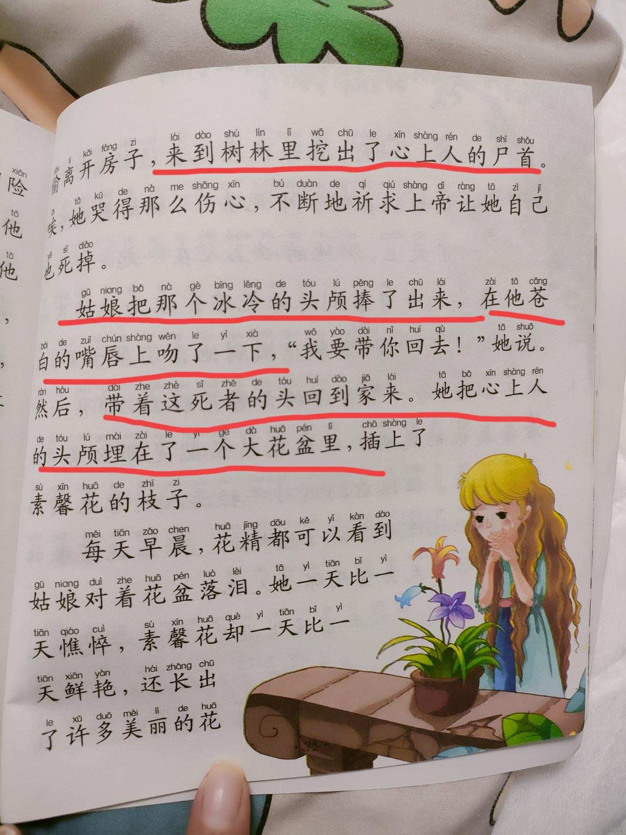 这种内容为何会出现在学龄前儿童的书刊上? 在网上给家里读幼儿园的孩子买了《365夜好故事》系列的几本书,因为看到封面上写的有一句“小娃娃的第一本经典成长小故事”,我猜测书的内容应该很适合小孩子,没想到陪孩子阅读时竟然被书中的一个故事惊到了,在一篇《玫瑰花精》的故事里竟然出现了很多恐怖的场景: 1、“他抽出一把又长又快的刀,把年轻人的头颅砍了下来,同尸体一起埋在一棵菩提树下。” 2、“来到森林里挖出了心上人的尸首...” 3、“姑娘把那个冰冷的头颅捧了出来,在他苍白的嘴唇上吻了一下......” 4、“带着这死者的头回到家来,她把心上人的头颅埋在了一个大花盆里......” 5、“花盆打碎了,一个白色的头颅现了出来......”