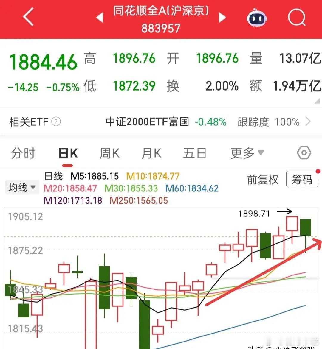 再看我们重点关注的全A行情,对应的就是中证2000指数。说它走势走坏了,显然不切实际——它连10日线都没跌破,今天只是回踩10日线就迅速拉了回来。这种形态下,只有跌破10日线且无法收回,才算真正走坏,目前来看趋势依旧向上。