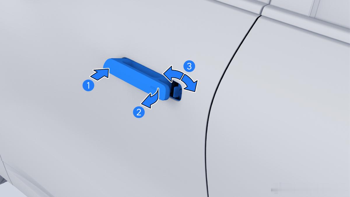 沿指示1方向按压车门外拉手左端,弹起车门外拉手,同时沿指示2方向拉起车门外拉手并保持。