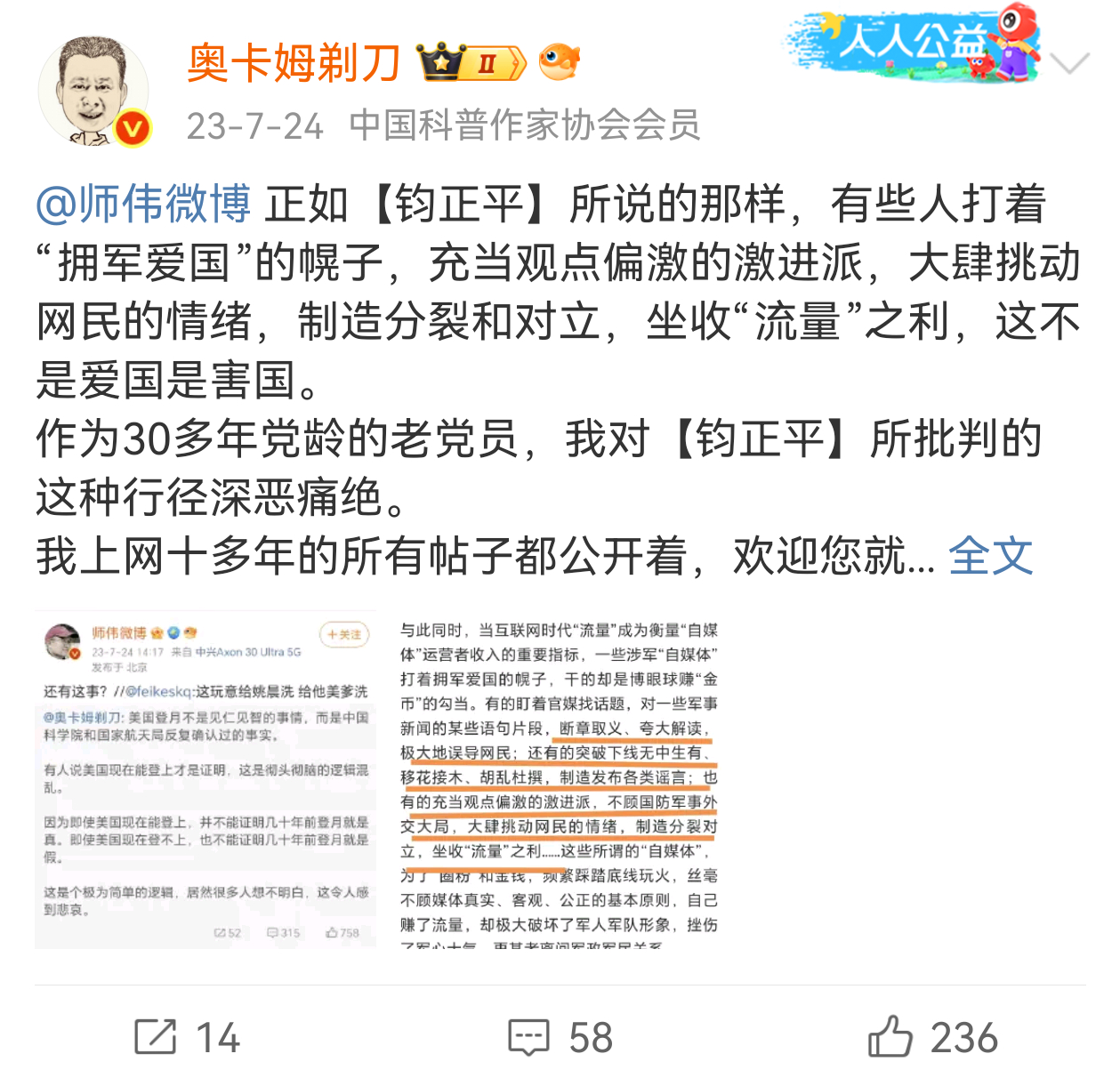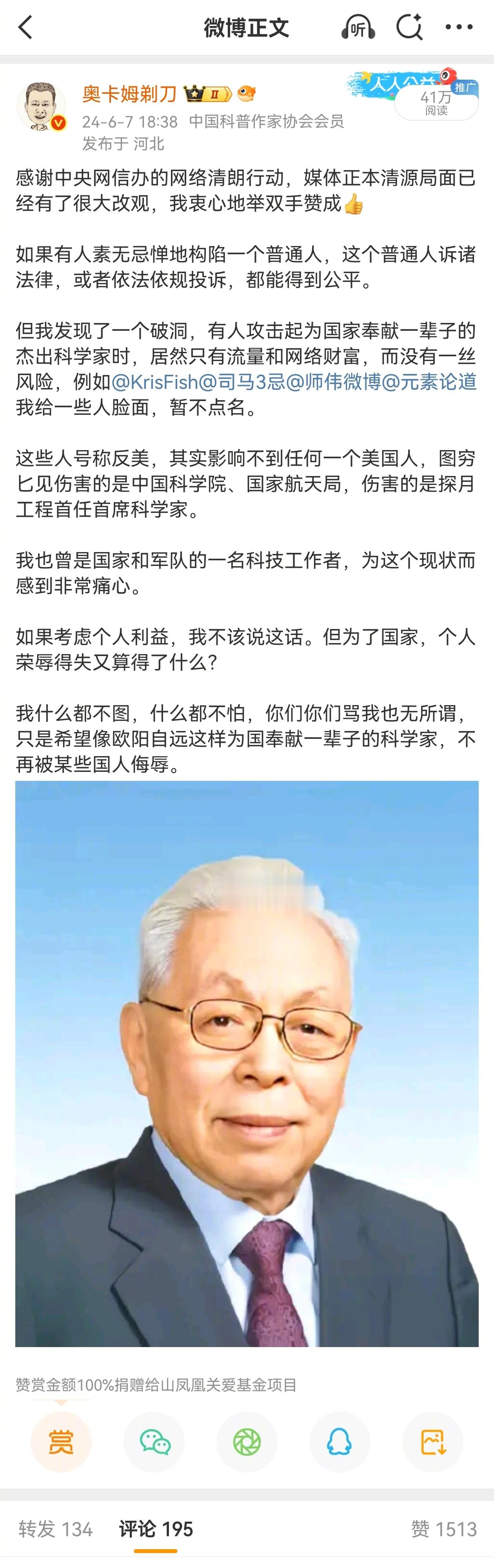 我判断他不是故意造谣,而是因为主观倾向性太强,而轻信了关于欧阳自远院士、航天员奥尔德林、载人飞船设计总师张博南的谣言。