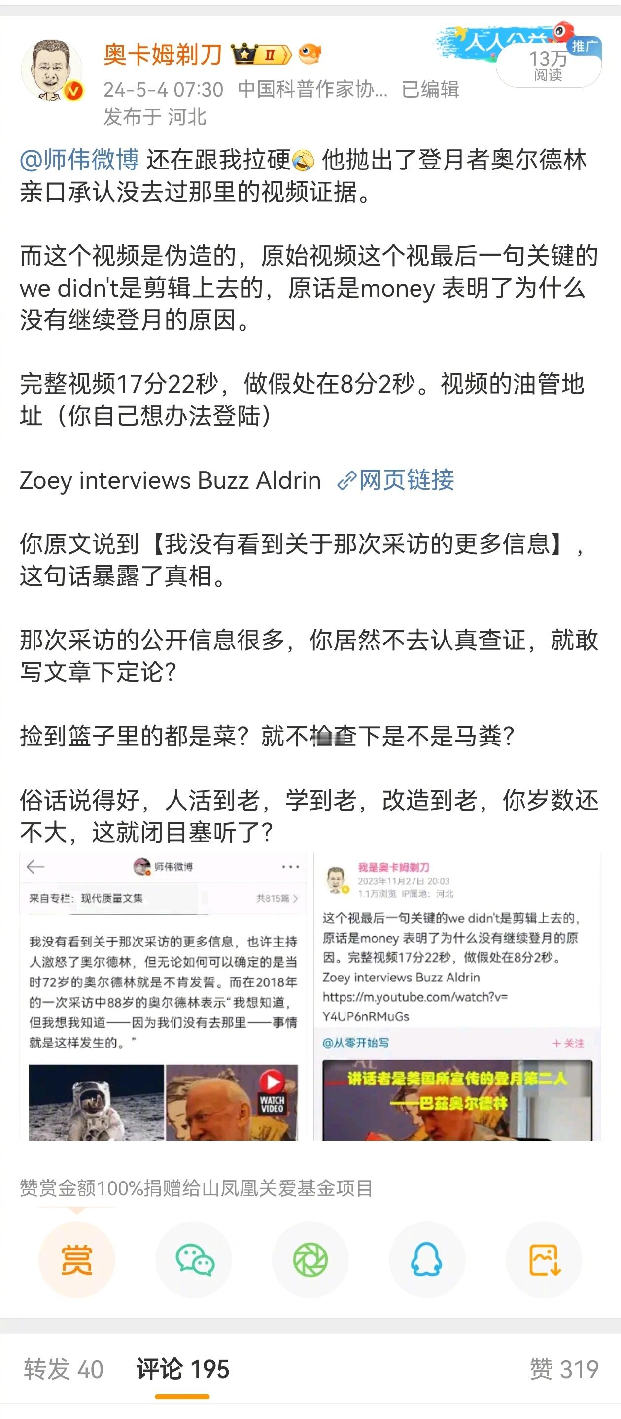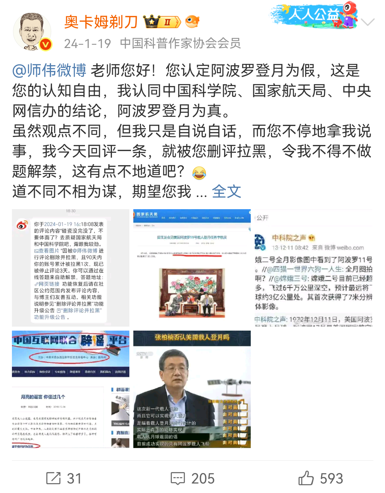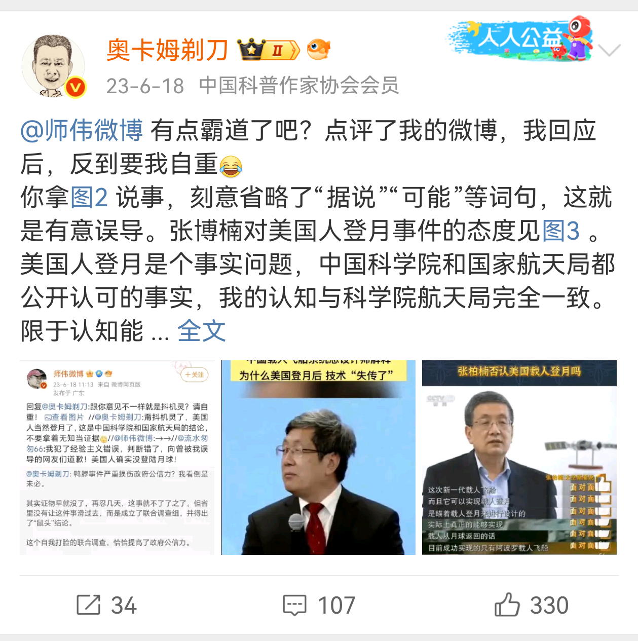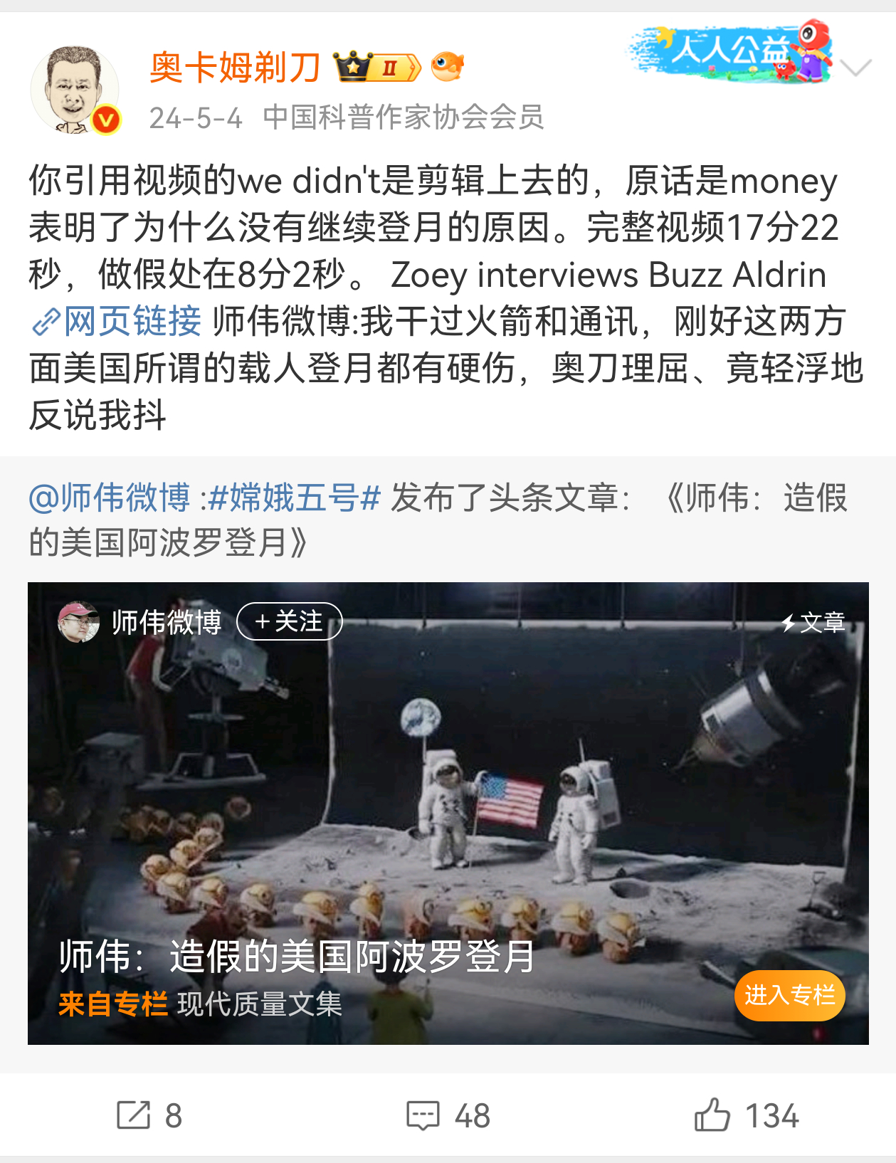 我与师伟在阿波罗载人登月问题上有过多次交锋,揭露了他多次谣言,也因此有点对立。