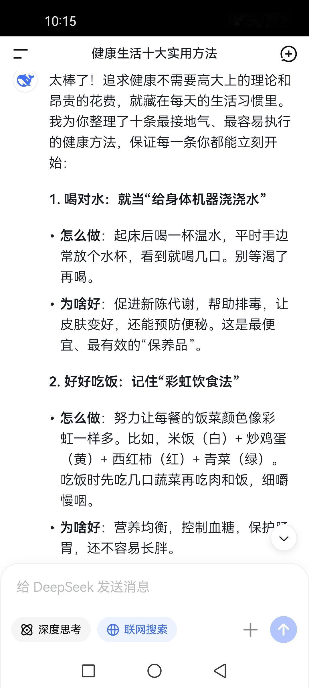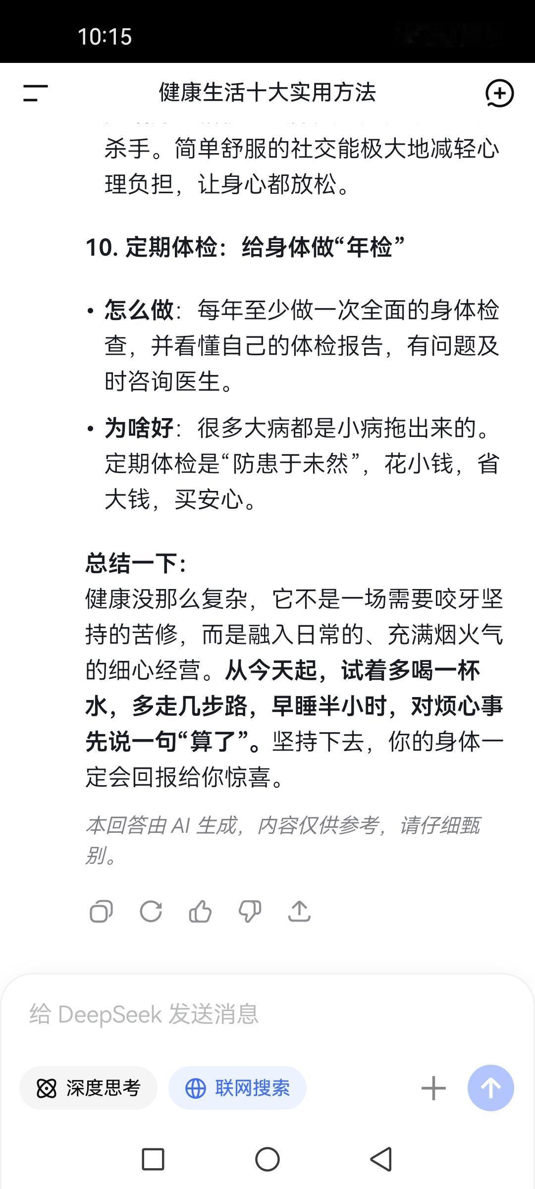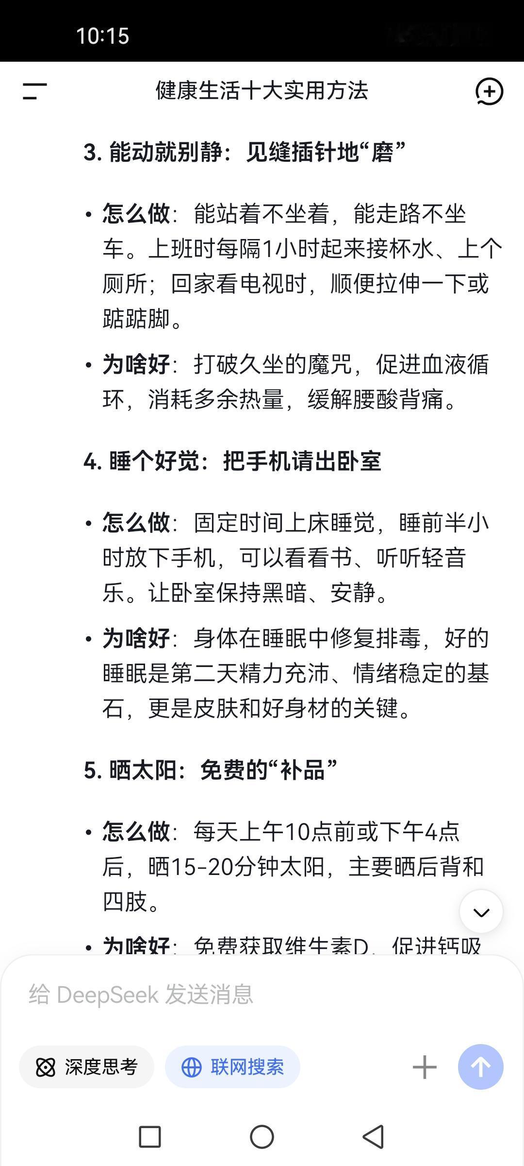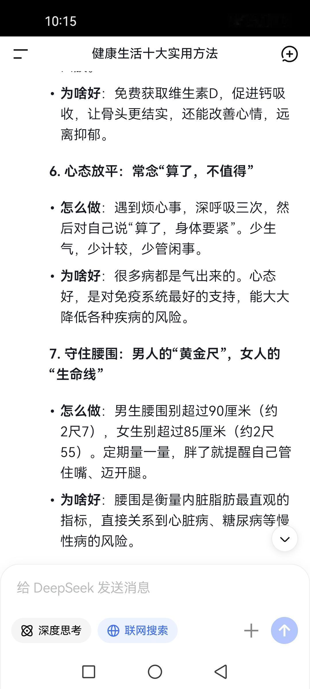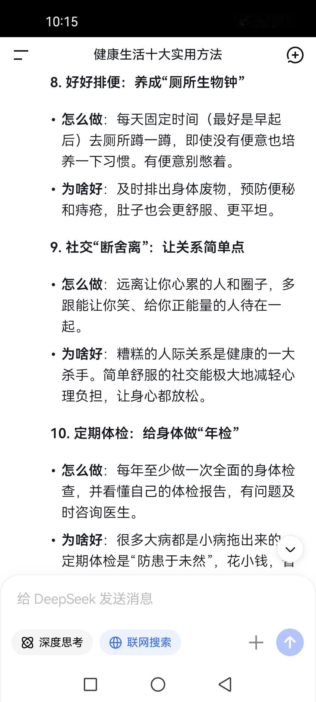 跟着deepseek做十个养生法: 1. 喝对水:就当“给身体机器浇浇水” · 怎么做:起床后喝一杯温水,平时手边常放个水杯,看到就喝几口。别等渴了再喝。 · 为啥好:促进新陈代谢,帮助排毒,让皮肤变好,还能预防便秘。这是最便宜、最有效的“保养品”。 2. 好好吃饭:记住“彩虹饮食法” · 怎么做:努力让每餐的饭菜颜色像彩虹一样多。比如,米饭(白)+ 炒鸡蛋(黄)+ 西红柿(红)+ 青菜(绿)。吃饭时先吃几口蔬菜再吃肉和饭,细嚼慢咽。 · 为啥好:营养均衡,控制血糖,保护肠胃,还不容易长胖。 3. 能动就别静:见缝插针地“磨” · 怎么做:能站着不坐着,能走路不坐车。上班时每隔1小时起来接杯水、上个厕所;回家看电视时,顺便拉伸一下或踮踮脚。 · 为啥好:打破久坐的魔咒,促进血液循环,消耗多余热量,缓解腰酸背痛。 4. 睡个好觉:把手机请出卧室 · 怎么做:固定时间上床睡觉,睡前半小时放下手机,可以看看书、听听轻音乐。让卧室保持黑暗、安静。 · 为啥好:身体在睡眠中修复排毒,好的睡眠是第二天精力充沛、情绪稳定的基石,更是皮肤和好身材的关键。 5. 晒太阳:免费的“补品” · 怎么做:每天上午10点前或下午4点后,晒15-20分钟太阳,主要晒后背和四肢。 · 为啥好:免费获取维生素D,促进钙吸收,让骨头更结实,还能改善心情,远离抑郁。 6. 心态放平:常念“算了,不值得” · 怎么做:遇到烦心事,深呼吸三次,然后对自己说“算了,身体要紧”。少生气,少计较,少管闲事。 · 为啥好:很多病都是气出来的。心态好,是对免疫系统最好的支持,能大大降低各种疾病的风险。 7. 守住腰围:男人的“黄金尺”,女人的“生命线” · 怎么做:男生腰围别超过90厘米(约2尺7),女生别超过85厘米(约2尺55)。定期量一量,胖了就提醒自己管住嘴、迈开腿。 · 为啥好:腰围是衡量内脏脂肪最直观的指标,直接关系到心脏病、糖尿病等慢性病的风险。 8. 好好排便:养成“厕所生物钟” · 怎么做:每天固定时间(最好是早起后)去厕所蹲一蹲,即使没有便意也培养一下习惯。有便意别憋着。 · 为啥好:及时排出身体废物,预防便秘和痔疮,肚子也会更舒服、更平坦。 9. 社交“断舍离”:让关系简单点 · 怎么做:远离让你心累的人和圈子,多跟能让你笑、给你正能量的人待在一起。 · 为啥好:糟糕的人际关系是健康的一大杀手。简单舒服的社交能极大地减轻心理负担,让身心都放松。 10. 定期体检:给身体做“年检” · 怎么做:每年至少做一次全面的身体检查,并看懂自己的体检报告,有问题及时咨询医生。 · 为啥好:很多大病都是小病拖出来的。定期体检是“防患于未然”,花小钱,省大钱,买安心。 总结一下: 健康没那么复杂,它不是一场需要咬牙坚持的苦修,而是融入日常的、充满烟火气的细心经营。 从今天起,试着多喝一杯水,多走几步路,早睡半小时,对烦心事先说一句“算了”。坚持下去,你的身体一定会回报给你惊喜。
