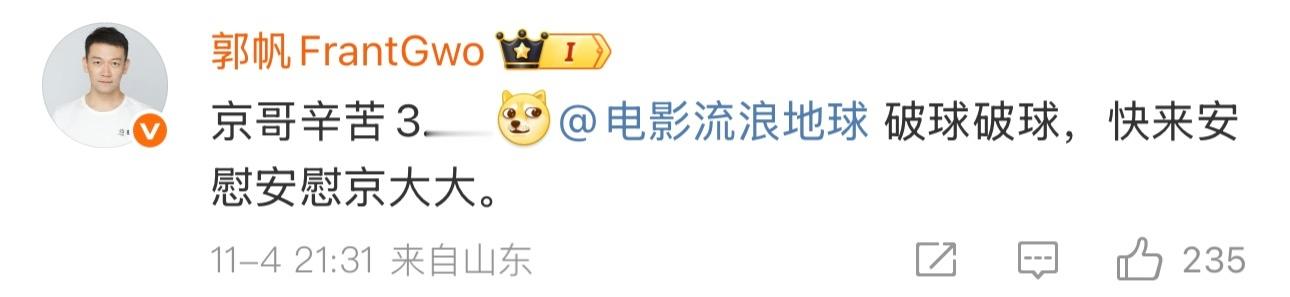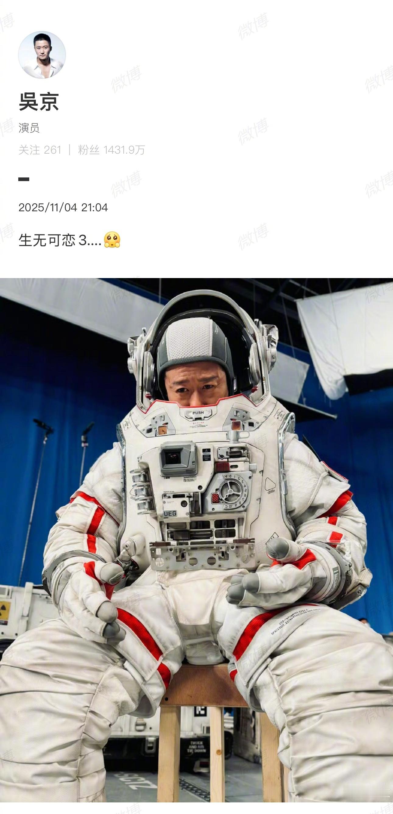吴京晒流浪地球3片场照片吴京发博晒《流浪地球3》花絮照:“生无可恋3….[可怜]”导演郭帆也火速互动。影片已定档2027大年初一,你期待吗?
