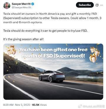 特斯拉将在下个月之前允许车主赠送FSD【来自懂车帝车友圈】