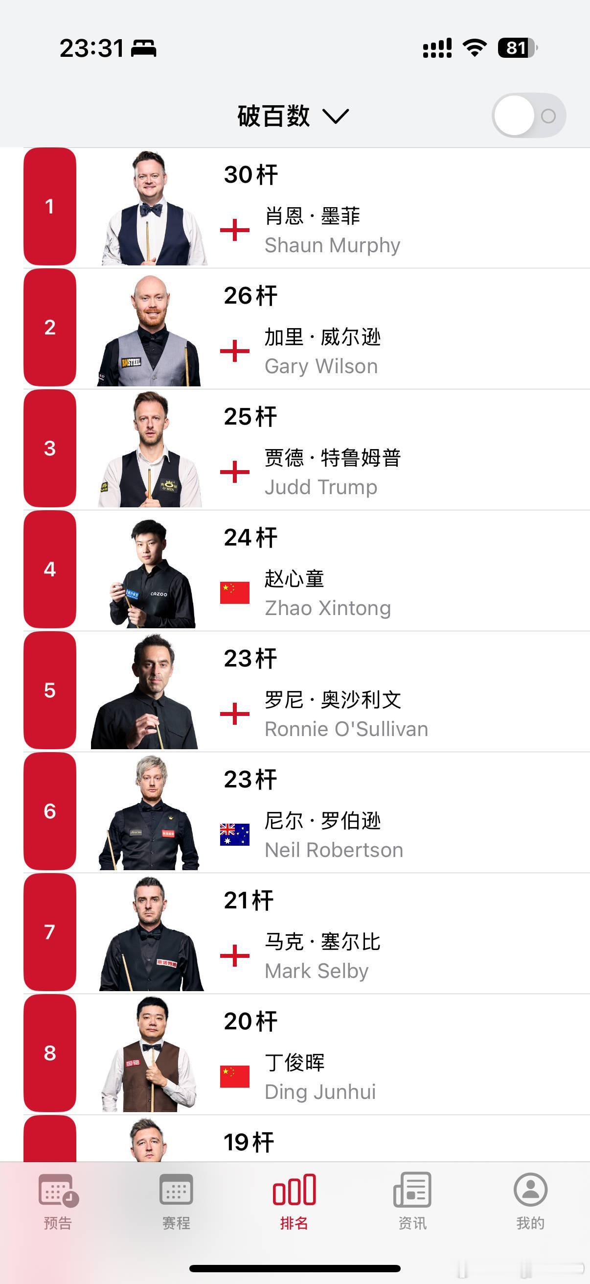 不苟言笑的丁俊晖也有可爱的一面,晋级16强也送出飞吻回报球迷。 本赛季他的单杆破百数20杆,排名进入前十,墨菲30杆跃居榜首。