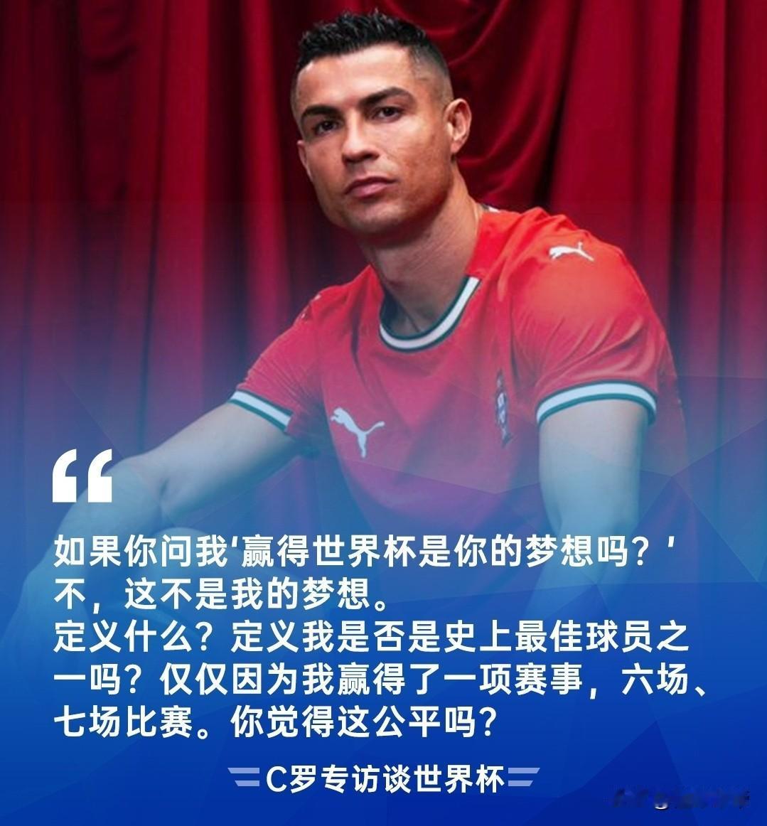C罗说的对,世界杯不能定义C罗的伟大! 今天晚上知名记者摩根放出了与C罗访谈的内容,其中聊到了世界杯的话题,C罗表示,世界杯不是自己的梦想,一项六七场比赛的赛事不能定义自己的伟大, 懂球的都知道,C罗说的没毛病,世界杯冠军虽然是每个球员的梦想,但是却不能定义一个球员的伟大,C罗的伟大是20多年的职业生涯积累起来的,而不是世界杯可以定义的。 足坛有五六百人有世界杯冠军,但是伟大的巨星只有那么几个,因此世界杯并不能定义C罗,懂球的都知道C罗是足坛最伟大的巨星,以后不要再拿世界杯质疑C罗了。