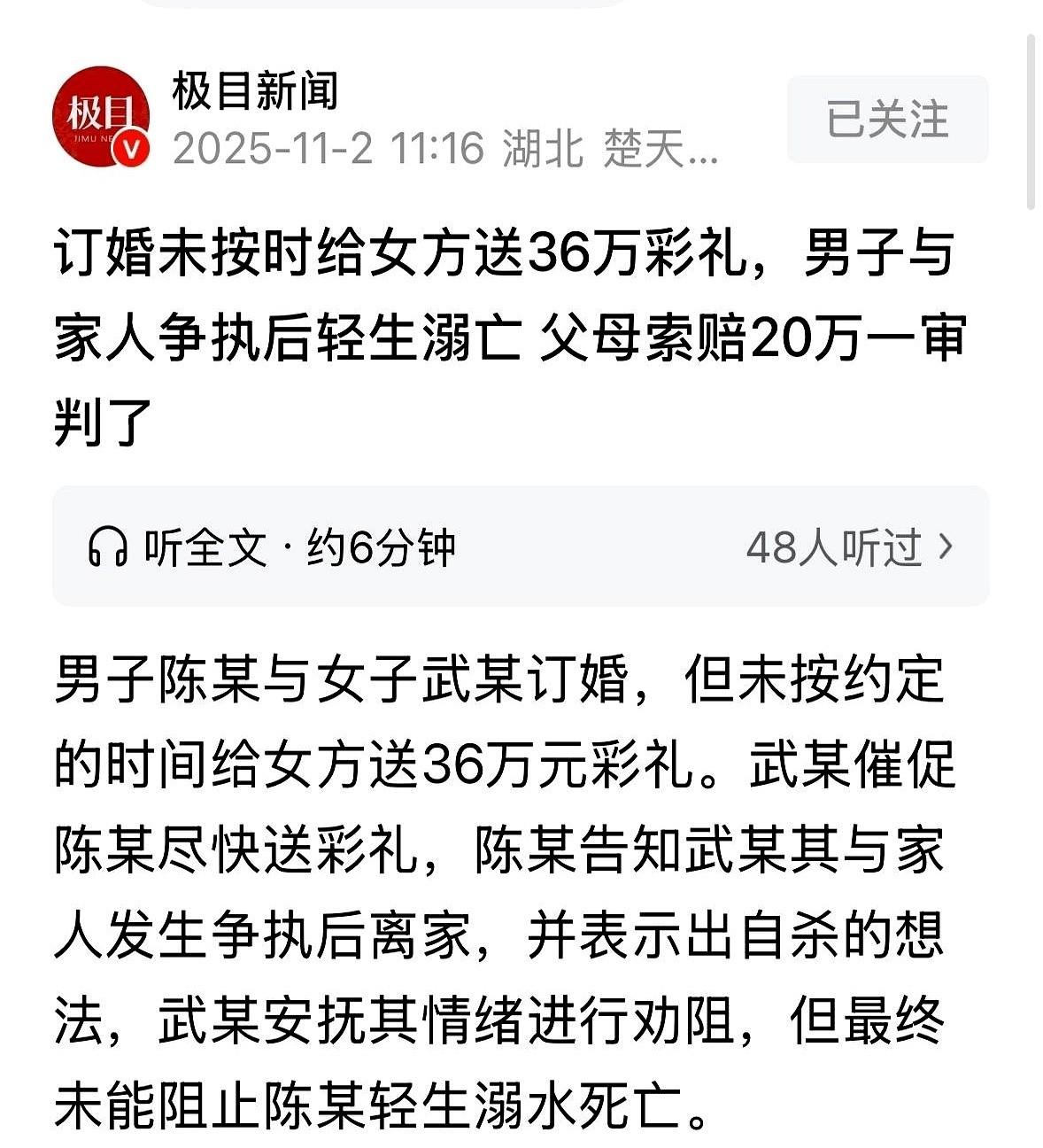 36万,一条命。 就因为彩礼没按时给,一个二十多岁的小伙子,跳河了。 他爸妈把他未婚妻告了,法院判:不赔。 这事儿一出来,网上吵翻了天。有人骂女方家是逼债,有人说这男的太脆弱。 可我看完,就觉得心里堵得慌。 真的只是钱的事吗? 你想想,他被夹在中间,是什么滋味? 一边是自己的爹妈,因为钱的事,估计没少跟他吵,甚至可能骂他没本事;另一边是等着办婚礼的未婚妻,一个劲儿地催。 全世界都在跟他要一个结果,可没人问他累不累。 他最后发了句“我活不下去了”。 那一刻,他不是不想活,他是觉得,这么活着,太没意思了。好像自己不是一个人,就是个为了完成任务、为了让两家人满意的工具。 法院从法理上判,没毛病。成年人,得为自己的选择负责。 可人不是机器。 说白了,压死他的,根本不是那36万。 是那种无路可退的绝望,是那种连说个“老子不干了”的勇气都没有的窒息感。他不是输给了彩礼,他是输给了那个觉得“除了死,别无他法”的自己。 这才是整件事里,最让人心疼的地方。