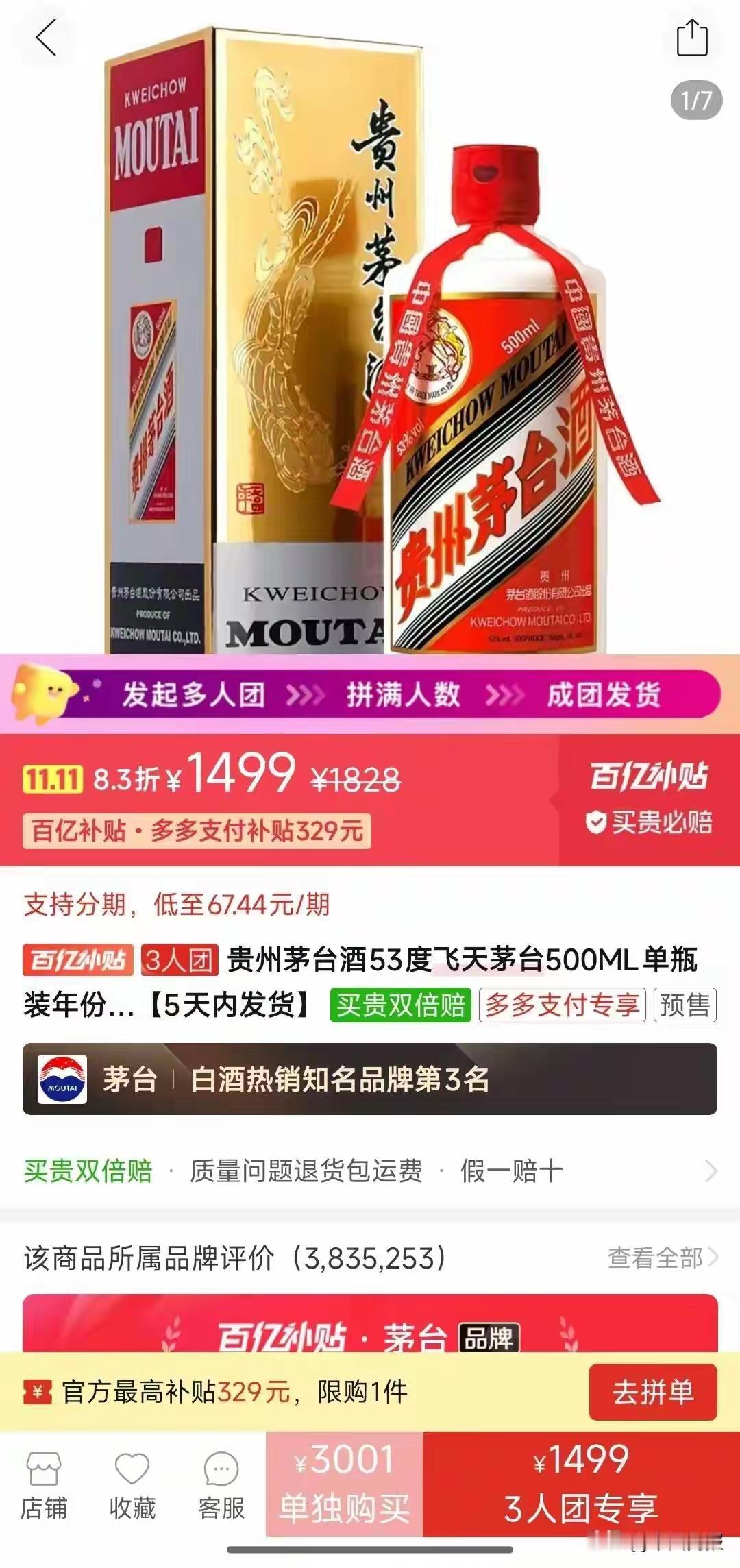 在拼多多上,53度飞天茅台双瓶装补贴后价格跌至3150元(两瓶),约合每瓶1575元;53度飞天茅台(500ml)单瓶的三人成团价仅为1499元。上述茅台酒线上店铺由多个酒类专营店运营,但均表示“该商品100%正品,假一赔十”,并带有“百亿补贴”标识。小编对酒虽然不是很了解,但茅台毕竟大名鼎鼎,还是略知一二。居然跌的这么厉害,真的还是假的。拼夕夕上还是让人存疑啊,毕竟拼夕夕之前出过诸多问题。不过懂酒的人一般也不会蠢到乱买,你们说对吧?大家都小心翼翼,毕竟关乎自己的利益。酒这种东西能消愁也能带来忧愁。你们说呢?(图片来源于网络)茅台北京价格 飞天茅台 茅台退货潮 老茅台回收价格