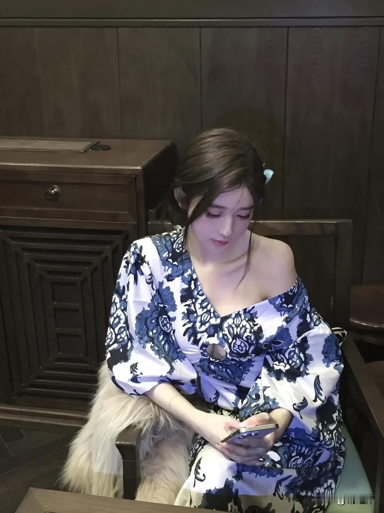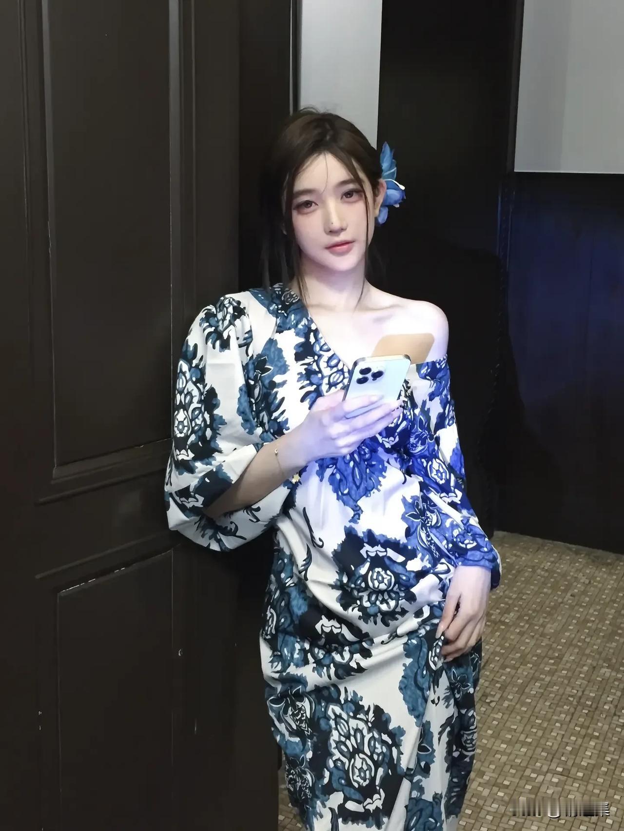 优雅蓝花裙,楼梯上的迷人时刻🌸✨