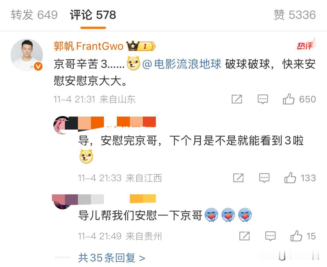 吴京,深夜发文! 11月5日,51岁的吴京,冲上热搜,这一次,不是因为老婆谢楠,而是深夜不睡觉的他,晒出一张图片,配文只有短短5个字,却让网友瞬间炸开了锅,怎么回事?[泣不成声] 原来,吴京晒出了《流浪地球3》片场照片。 照片中,他身着笨重宇航服,表情疲惫,眼神空洞,并配文:“生无可恋3”,一看拍戏就拍的很辛苦,导演郭帆也火速评论“京哥辛苦”。 4月15日,电影《流浪地球3》官宣开机,吴京、沈腾等主演参加开机仪式,6月28日,官方微博发文祝马丽生日快乐,并宣布马丽加盟《流浪地球3》,乖乖,加上刘德华、李雪健等人,这阵容,真的太强大了。[泣不成声] 这两年,虽然吴京风评不好,但不得不说,他打开了中国“科幻片”的大门。 网友看到吴京如此辛苦,也纷纷安慰:“京哥加油,期待电影早日上映。[偷笑]” Ps:流浪地球1:票房46亿 流浪地球2:票房40亿 第三部,肯定也大卖[机智]