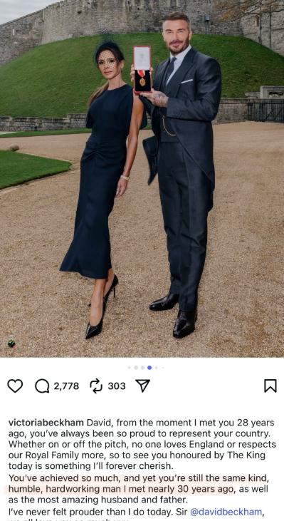 贝克汉姆被授予KBE(爵级司令勋章),发文感谢父母、妻子、孩子,就是没提白富美大