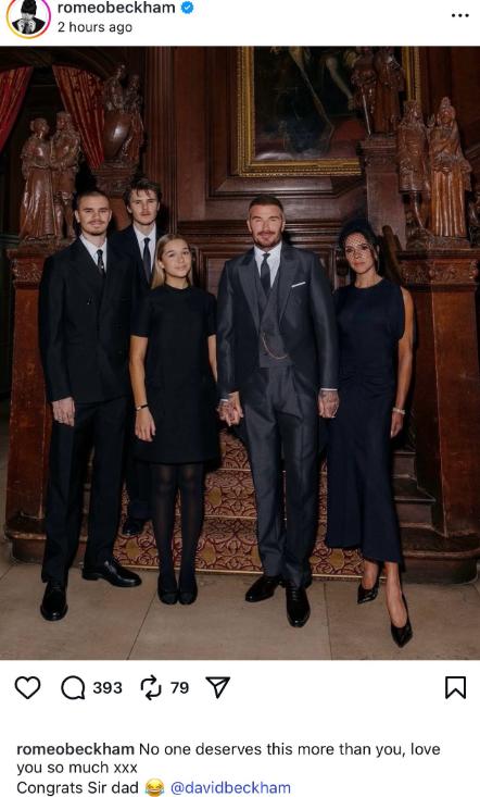 贝克汉姆被授予KBE(爵级司令勋章),发文感谢父母、妻子、孩子,就是没提白富美大儿媳!11月4日知名足球运动员贝克汉姆被查尔斯国王授勋,在这高光时刻她感谢了每一个人。 然而贝克汉姆的大儿子布鲁克林并没有到场祝贺老父亲,大儿媳就不用说了,不少网友纷纷猜测,看来大儿媳妮可拉与婆家人不和是真的,毕竟拍大合影时没有布鲁克林夫妇,荣誉加身的贝克汉姆也没有获得长子的祝福与捧场,大儿子真的是白养了吗?