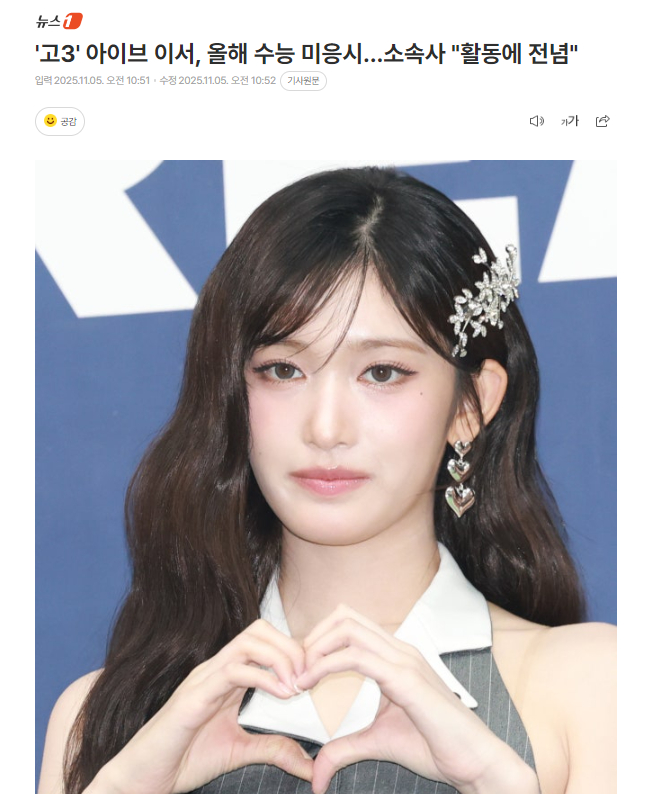 5日,IVE所属社Starship方面表示:“IVE李瑞最终决定不参加今年的高考。我司与李瑞就高考问题进行了长期的讨论,根据其想要专注于活动的意见,最终做出了这一决定。未来将根据艺人本人的意见,在其能够集中于大学生活的时候再考虑是否升学。”