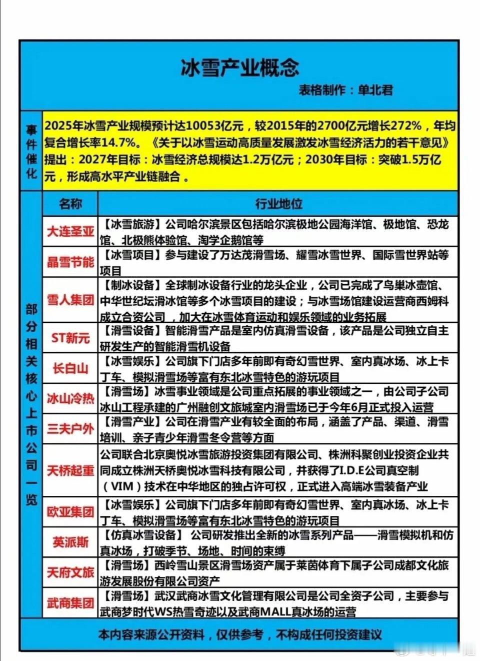 我国冰雪产业规模呈爆发式增长,2025年预计达10053亿元,政策明确2027年、2030年产业规模目标,推动产业链高水平融合。行业涵盖冰雪旅游、设备制造、场馆建设、娱乐服务等领域,政策红利与市场需求共振icon,产业链各环节企业在场景打造、技术创新、资源整合等方面迎来发展机遇。