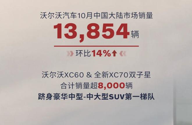 【沃尔沃汽车10月销量超1.38万辆,环比增长14%】日前,沃尔沃汽车官宣,10月份在中国大陆市场销量超1.38万辆,环比增长14%。其中,沃尔沃XC60、全新XC70合计销量超8000辆,跻身豪华中型/中大型SUV第一梯队。这几年伴随着新能源化趋势,沃尔沃汽车也加快转型步伐。在全新XC70的带动下,沃尔沃新能源车型在国内市场迎来爆发式增长,今年累计销量超1.48万辆,同比增长34%,标志着沃尔沃品牌在电气化赛道上进入全面提速模式。【来自懂车帝车友圈】