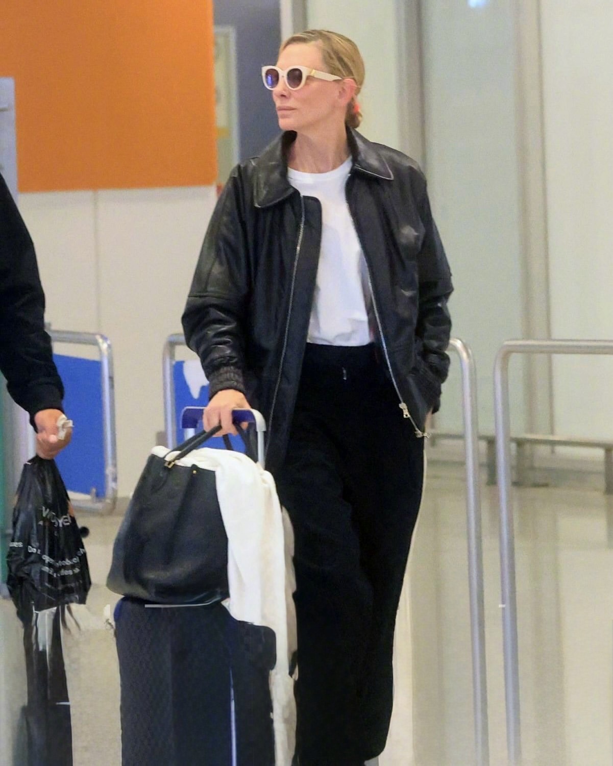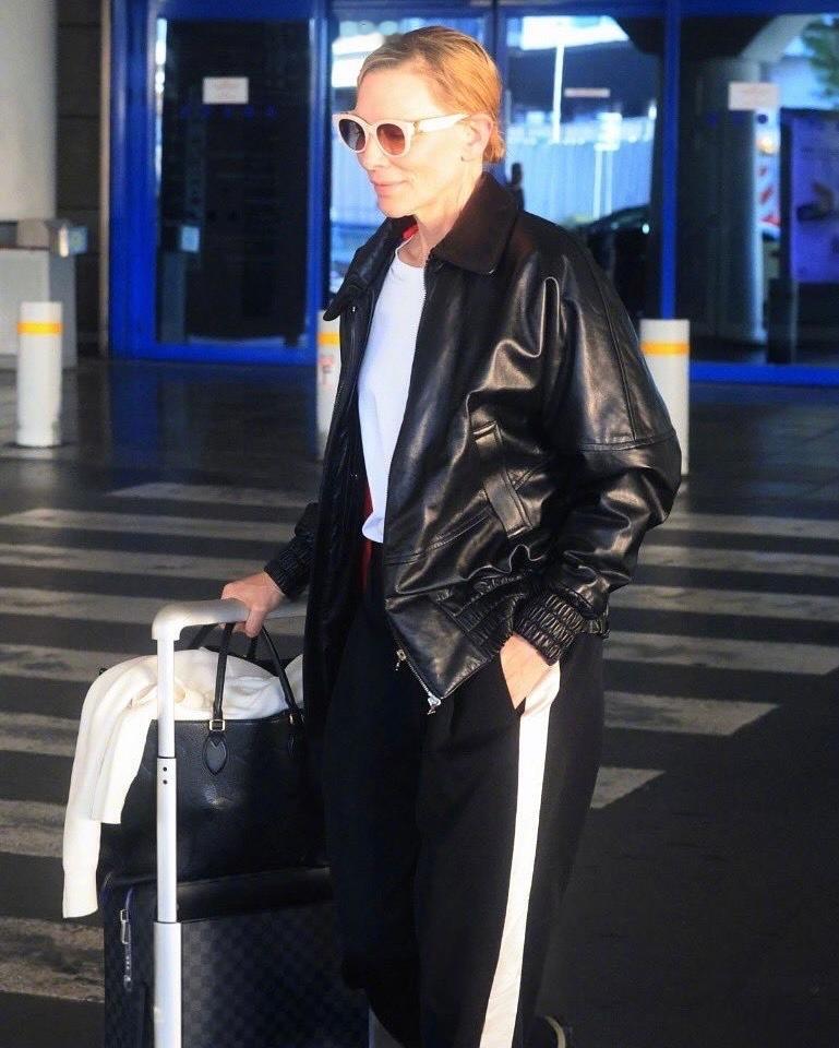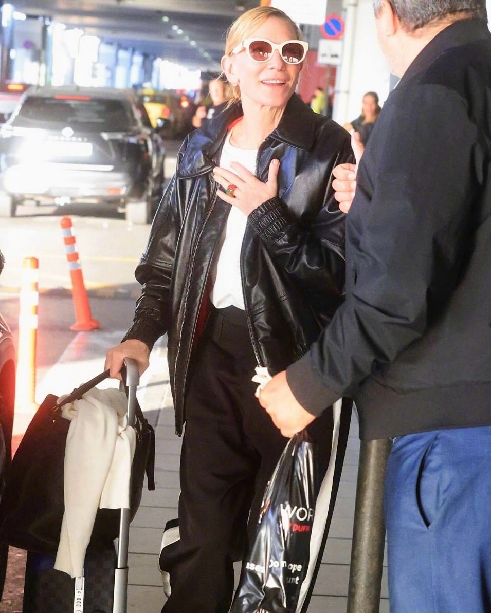 当地时间11月3日,凯特·布兰切特乘坐从伦敦起飞的航班抵达雅典国际机场。她将在当地停留十天,拍摄她的最新电影《SWEETSICK》,该片由爱丽丝·伯奇(Alice Birch)执导,采用英语和希腊语双语拍摄。身穿复古风男士皮夹克,内搭白T恤,手拎LV手袋和登机箱,非常有型的一身配搭。。米拉服饰解析
