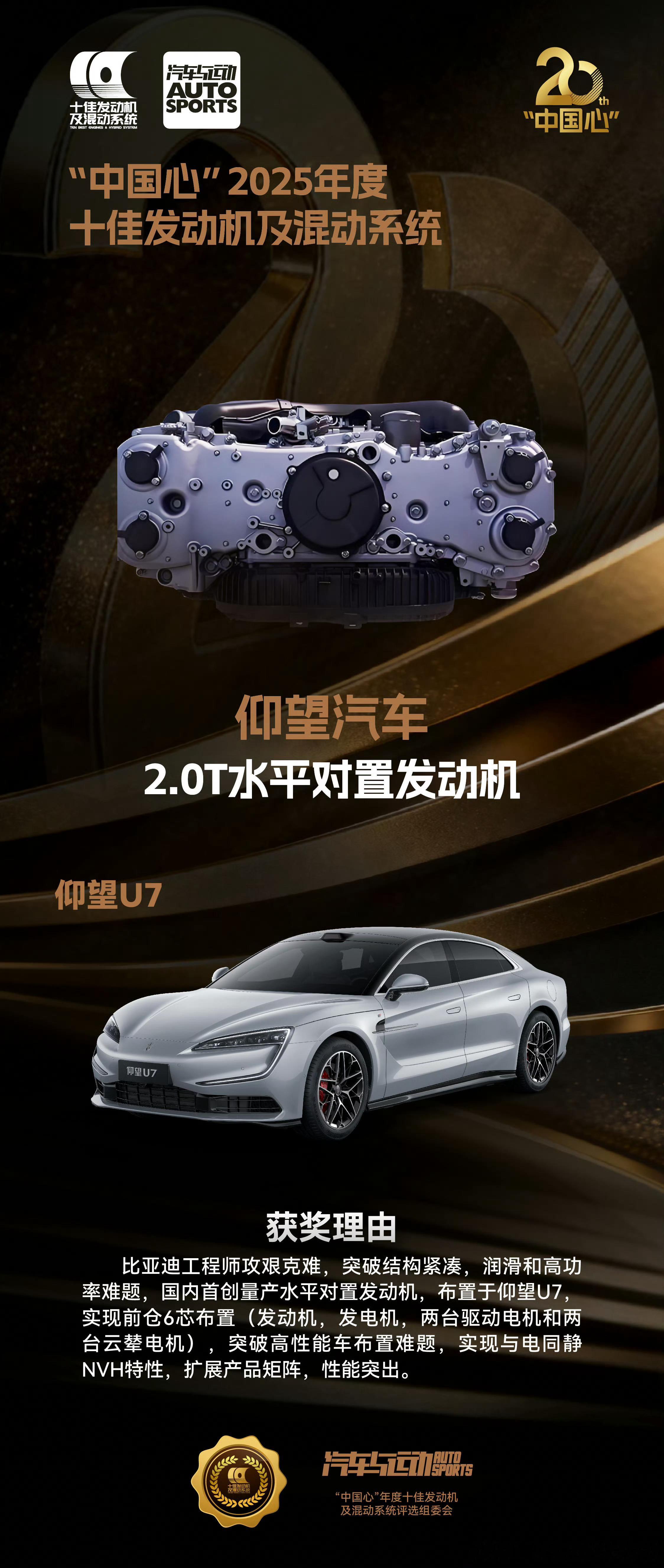 汉L和唐L有全球首发的超级e平台,有兆瓦闪充和双枪充电以及580kw单电机;仰望U7混动版则是全球第三家、中国汽车品牌首个量产的水平对置发动机,每一个都是行业顶尖,拿奖实至名归。