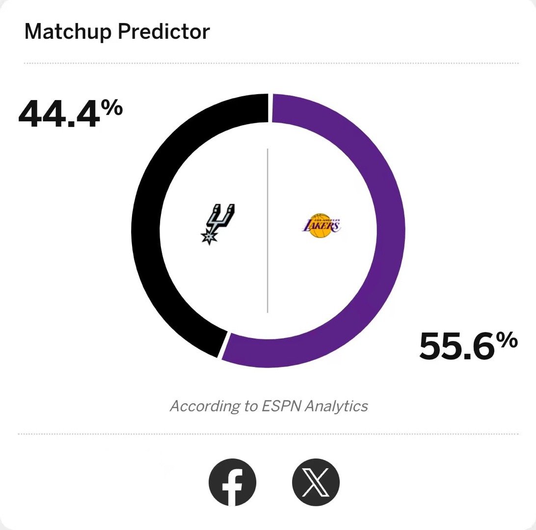 虽然仍是伤兵满营,但ESPN给出了湖人55.6%的胜率!趁着这股气势拿下5连胜,顺便抢下西部第二吧!