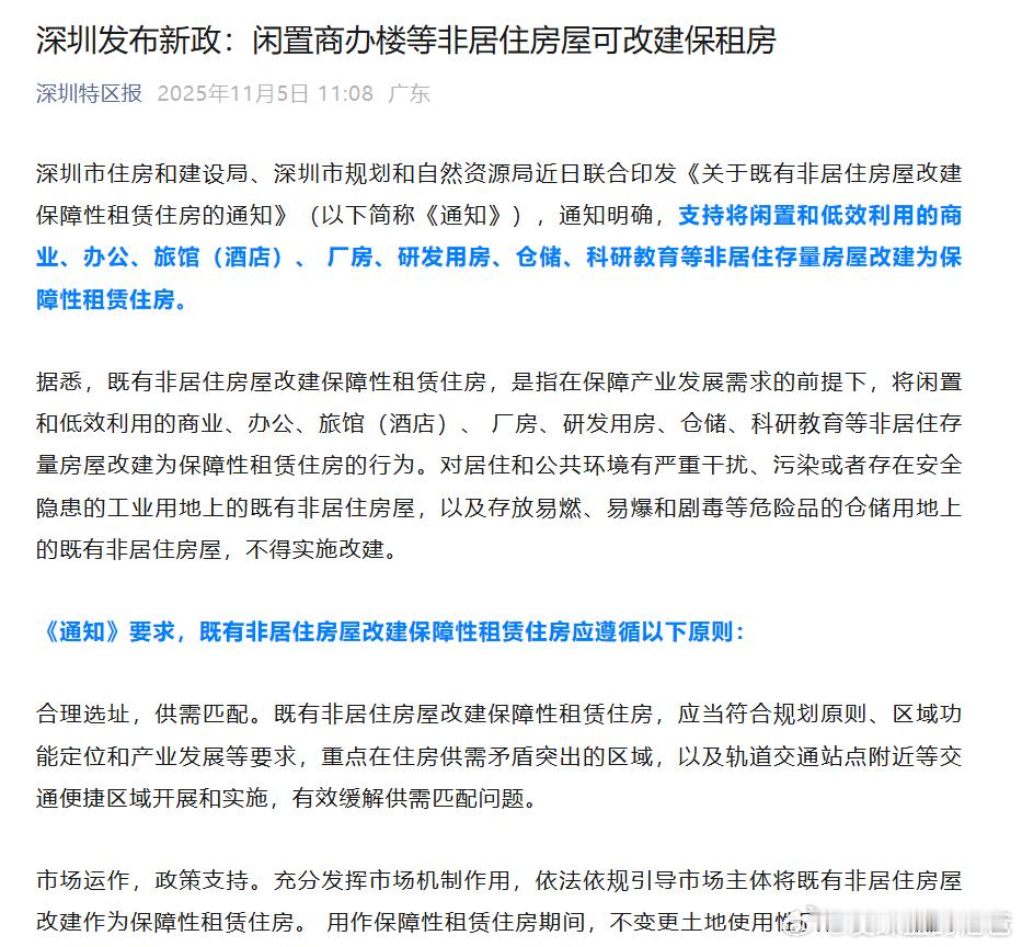 深圳发布新政:闲置商办楼等非居住房屋可改建保租房。