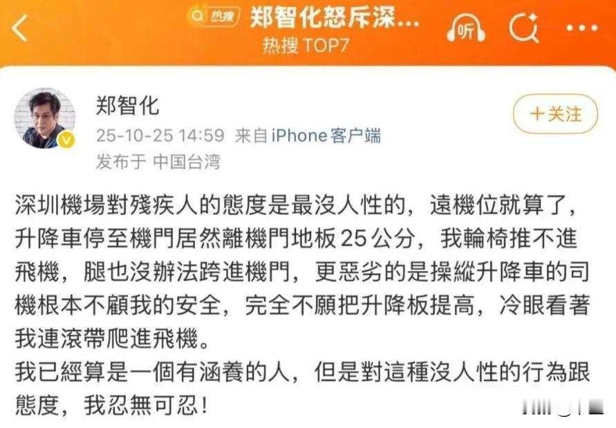 郑智化摔进热搜,机场秒道歉,公众却骂他演戏 前阵子郑智化在微博上发火,讲他在深圳机场登机时被逼得连走带爬,因为登机口有25公分高的台阶,他腿脚不方便,拄着拐杖走路都会疼,更不用说爬台阶,郑智化提到从小患小儿麻痹留下后遗症,平时站台上唱歌都在硬撑,每次出门都像打仗一样,这话发出后网友们全炸开锅,大家都觉得机场做法太不人道,骂声一片,深圳机场反应很快,12小时内就出来道歉,表示马上进行整改,态度显得挺诚恳。 然而没过两天,机场方面公布了当时的监控录像,画面中显示有多名工作人员围着郑智化,一路搀扶着他、协助他行走,全程提供帮助,根本不存在所谓“滚”或“爬”的情况。于是舆论开始转向,有人质疑郑智化故意捏造事实,认为他想借此炒作,甚至有人指责他利用残疾身份博取关注。后来郑智化解释说,自己当时情绪比较激动,原本想用“屁滚尿流”这个词,又觉得不太文雅,才改说成“连滚带爬”,其实只是想夸张表达一下。但公众并不接受这个说法,反而认为他在找借口,越是解释越显得心虚。 他还提到之前在别的机场也遇到过麻烦事,比如轮椅被要求检查、拐杖被强制托运,这些情况没有被拍到视频里,但确实都发生过。公众往往只关注视频里的那几分钟,却忽略了机场服务其实涉及很多环节,安检、值机、通道太窄、没有坡道、没人提前询问需求——这些才是残障人士日常出行真正遇到困难的地方。监控没拍到,不代表问题不存在。他那次情绪爆发更像是长期积累的结果,并不是为了吸引大家的注意。 深圳机场效率确实高,被网友叫做“卷尺哥”,听劝改得快,但问题不在于深圳机场反应慢,而是整个系统跟不上节奏,中国《无障碍环境建设法》实施才两年多,很多地方还是空架子,登机桥不是每个航班都配备,轮椅升降设备经常出故障,工作人员培训不到位,旅客信息也没有提前对接好,郑智化不是第一个遇到麻烦的人,但他影响力最大,所以成了这件事的导火索,官媒《浙江日报》后来写了四点内容,表达得很清楚:大家关心的是所有残障人士出行困难的问题,而不是郑智化一个人有没有说错话。 他实在扛不住压力,就在11月3号那天关掉所有社交账号,把发过的内容全部删除,只留下一句“谢谢你们给我退休的机会”,其实这已经不是张明第一次退出公众视野,早在1999年,他就因为腿疼得厉害告别舞台,直到2002年女儿恳求他回来唱歌,他才重新出现,而这次退得更彻底,不只是身体上累,更多是心里累,网上有人指责他矫情,有人说他蹭热度,可张明不过是个普通人,也会有情绪失控的时候,也会说出不恰当的话,但一旦被人贴上“残障歌手”这个标签,大家就期待他永远坚强、永远正确,容不得半点差错,这样的期待对他来说,比爬台阶还要艰难。 郑智化早年唱的歌,比如《水手》和《星星点灯》,都在讲人不服输、在困境中挣扎的故事,很多人把他当作精神上的榜样,但榜样也是普通人,也会累,也会生气,当他真的说出“我撑不住了”的时候,有些人反而觉得他形象崩塌了,其实不是他变了,而是这个社会还没学会接受真实的人,他不是在表演,是在表达痛苦,只是我们已经习惯看戏,却听不见背后的哭声。