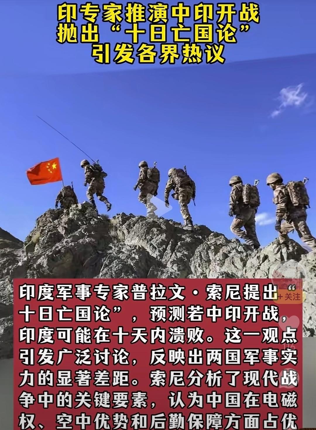 “10天,只需要10天!” 印专家泼出冷水,若中印开战,印度十天必崩! “印度与中国,根本不是一个量级的对手”。印度军事专家普拉文.索尼的推演,狠狠刺痛了印度人的“强军幻想”。 这位有“自知之明”的专家,说出了真相,摆出三大死穴: 死穴一:体系瘫痪,首日即成“聋哑军队”。 现代战争就像在玩游戏,谁先断网谁就输。 中国无人机群满天飞,卫星盯着看,电子战部队、卫星网络,能在开战瞬间,就让对手的指挥系统陷入瘫痪。 而印度的武器库堪称杂乱。俄制战机、美制无人机、以色列导弹……各说各话,互相听不懂指令。索尼直言:“这种拼凑式体系,在解放军电磁压制下,第一天就会乱成一锅粥”。 死穴二:后勤断血,跟纸糊的一样。 在海拔5000米高的战场,后勤才是真正的战斗力。 中国修了高原铁路、高速公路,能把物资像“快递”一样精准投送,恒温方舱让士兵在极寒中能保持战力。 反观印度边境,仍靠着驴驮马拉,一场大雪就能封山断粮,连防寒服都要高价进口。“前线弹药口粮撑不过3天,这仗还怎么打”? 死穴三:工业鸿沟,自己造不出家伙。 中国歼-20都已列装200多架了、歼-35也出来了,高超音速导弹指哪打哪,可印度的“光辉”战机折腾了30年还是难当大任。 更扎心的是:中国能自主量产所有核心装备,而印度武器超六成要靠买。一旦开打,航道被封,弹药库存打光之后只能扔石头了。 说实话,印度难得有一个清醒者,这对于日益膨胀的印度来说是件好事。及时敲打一下,以免铸成大错。 1962年的历史阴影尚未走远,如今,中印的差距已从“代差”变为“时代差。 印度有些人还在吹捧阵风战机无敌,光辉战机先进,期待与中国一战。而索尼一句“撑不过十天”,不知能打醒多少幻想者。 战场从不信口号,更不信狂妄,一旦动手,那就是用来实力说话。