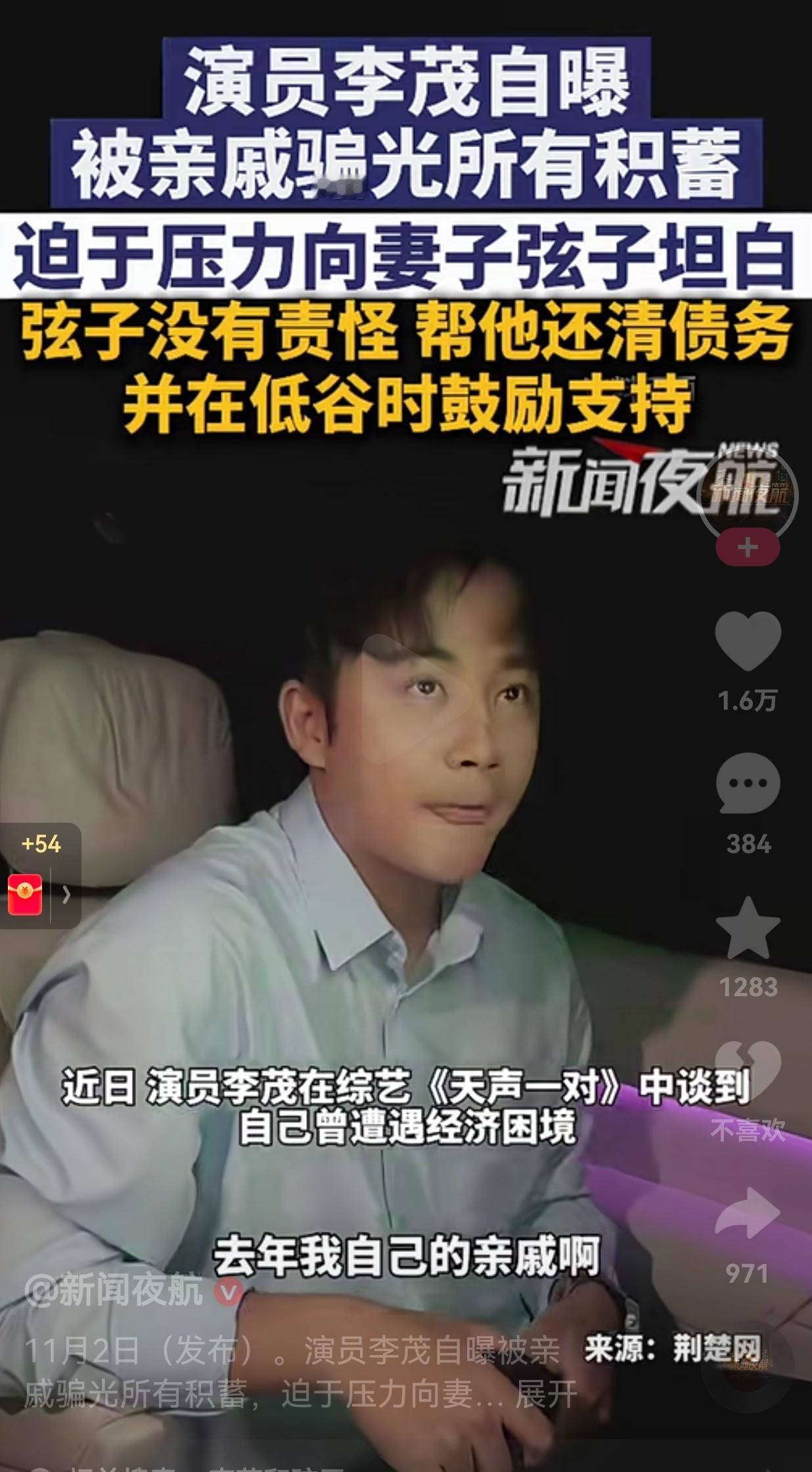 太悲催了!演员李茂在一档综艺节目中透露,自己曾遭遇经济困境,甚至是倾家荡产,背负高额负债,一度曾无力还款。 为什么会这样呢?据李茂讲述,去年,他被亲戚骗光所有的积蓄,因顾及亲情,他一直选择隐瞒,甚至就连对方父母也不知道,可是,为了金钱最后两人还是撕破脸皮。 那段时间,他过的很痛苦,信用卡还不上,为了还款,一度考虑跑专车补贴生活。 可是,就算他很努力地还款,还是债台高筑,眼看就要被压垮了 最后,迫于生活的压力,他不得不向妻子弦子坦白,妻子知道后,不仅没有责怪他,还主动询问“你要多少”,帮他还清了债务,并在低谷的时候,主动安慰他,给他自信心,让他坚强下去。 网友看到后评论说,真的是人心险恶!很多人为了利益,丝毫不顾及亲情。在他们眼里,亲戚就是用来骗的,我能用的上你,你就是我的亲戚,我用不上你,你啥也不是。 现实就是如此!所以说,别把亲戚看得太重,你跟他关系越好,关系越亲近,你越有钱,他就开始想方设法地从你那里搞钱。 如果你防备心重一点,只要涉及金钱问题一概不相信,不予理睬可能还不会上当受骗。万一你没有防备心,觉得是亲戚,可以相信,那你距离被骗就不远了。 大家觉得呢?欢迎大家评论区讨论留言。