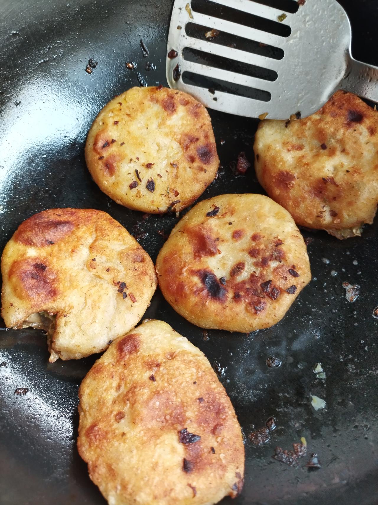 老伴儿,昨天包饺子剩点馅儿。 突发奇想,今天又烙上了馅儿饼。 胆子太大,又熬
