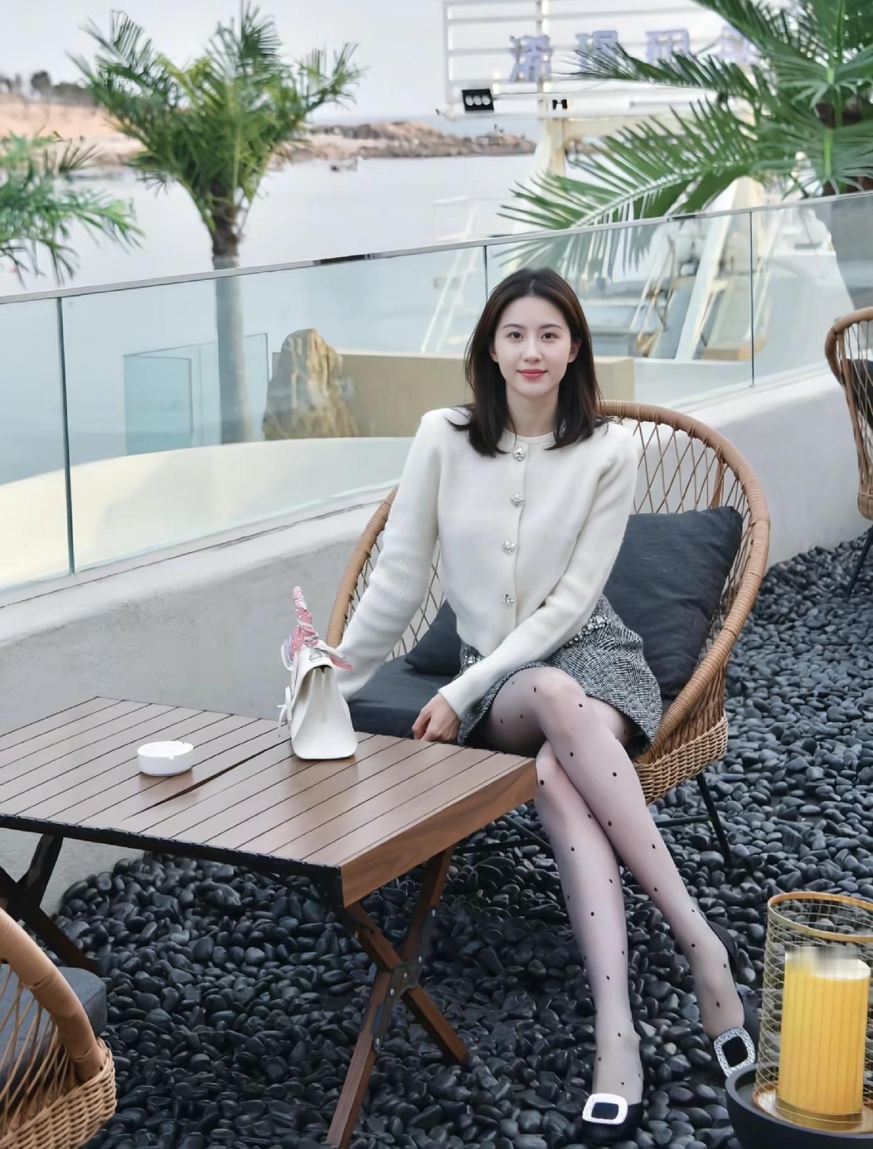 优雅气质穿搭,灰色连衣裙搭配印花披肩,咖啡馆里的时尚瞬间。