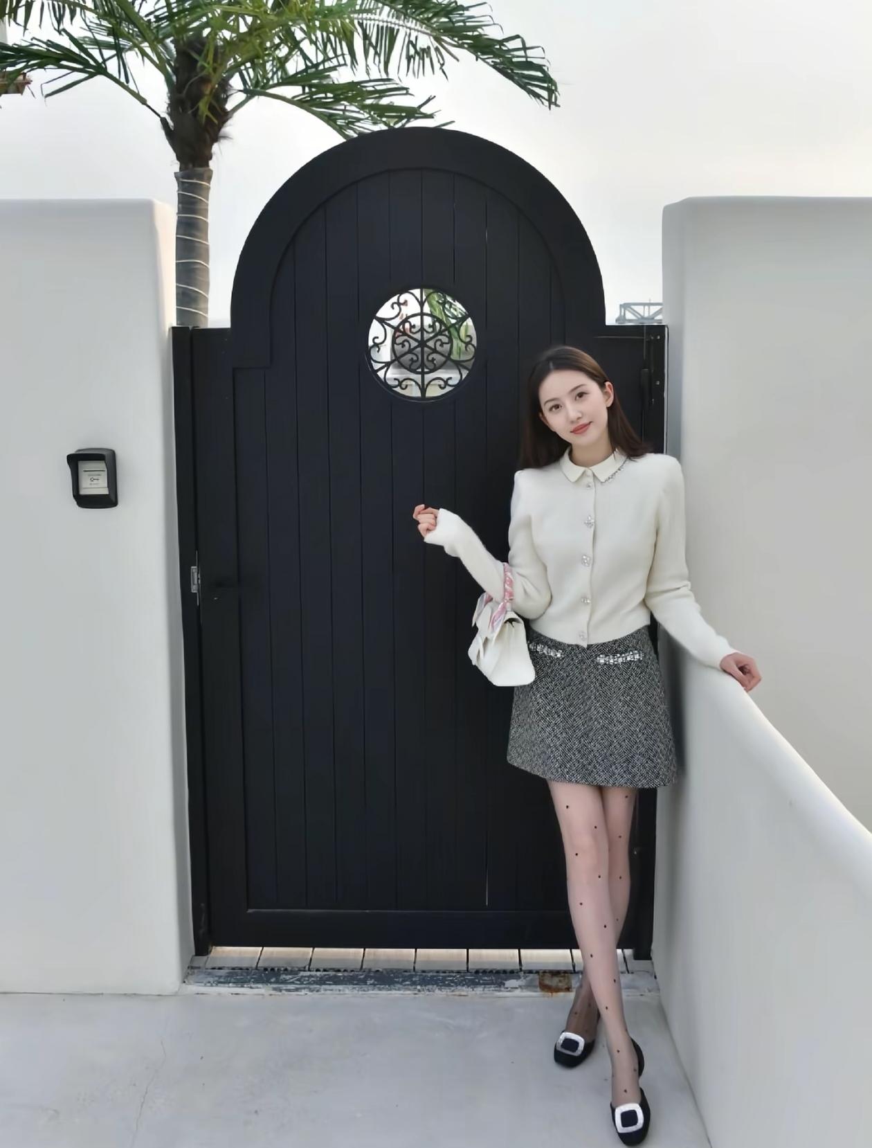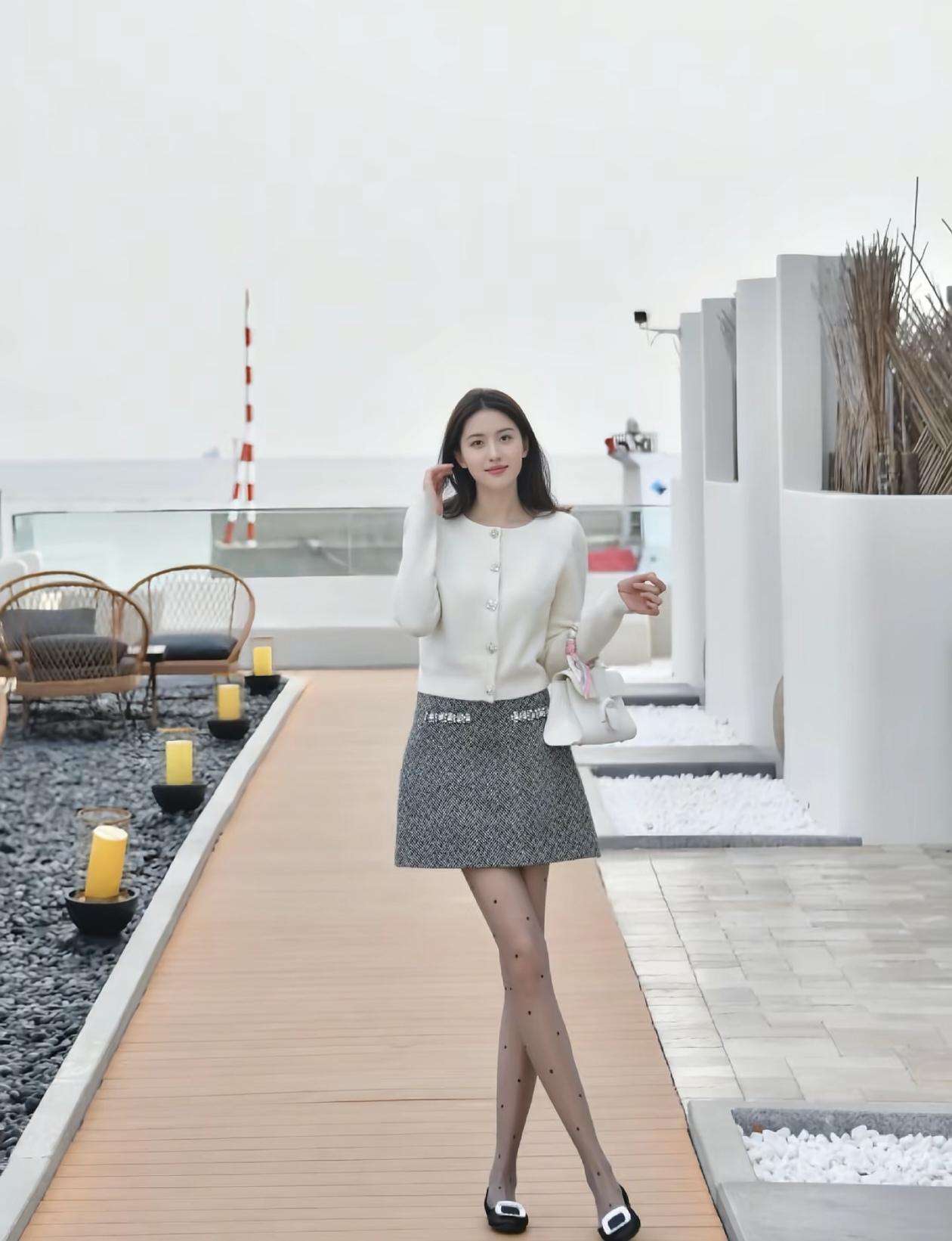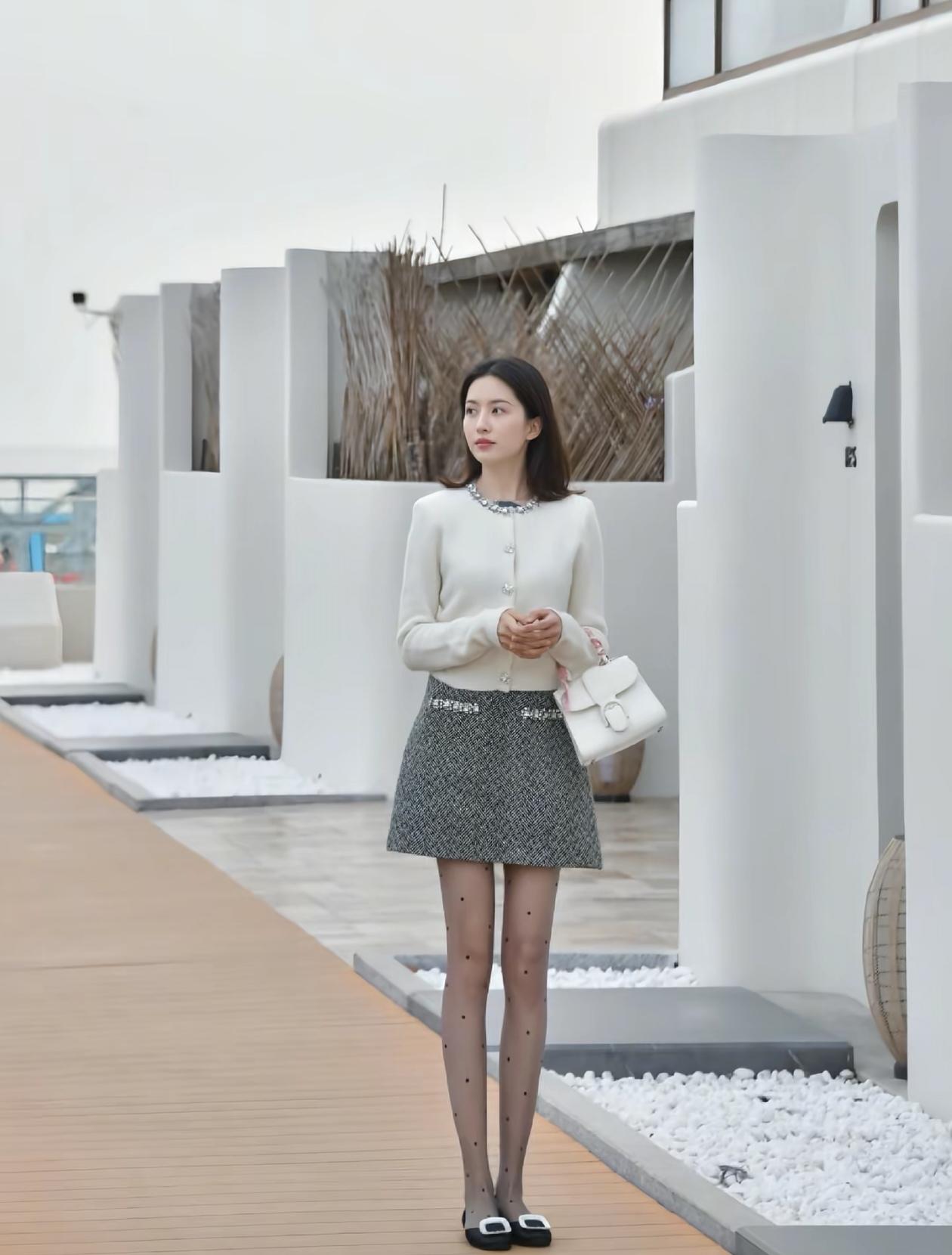 优雅都市风,白高领毛衣搭配灰色半身裙,手拿咖啡,漫步在现代建筑旁。