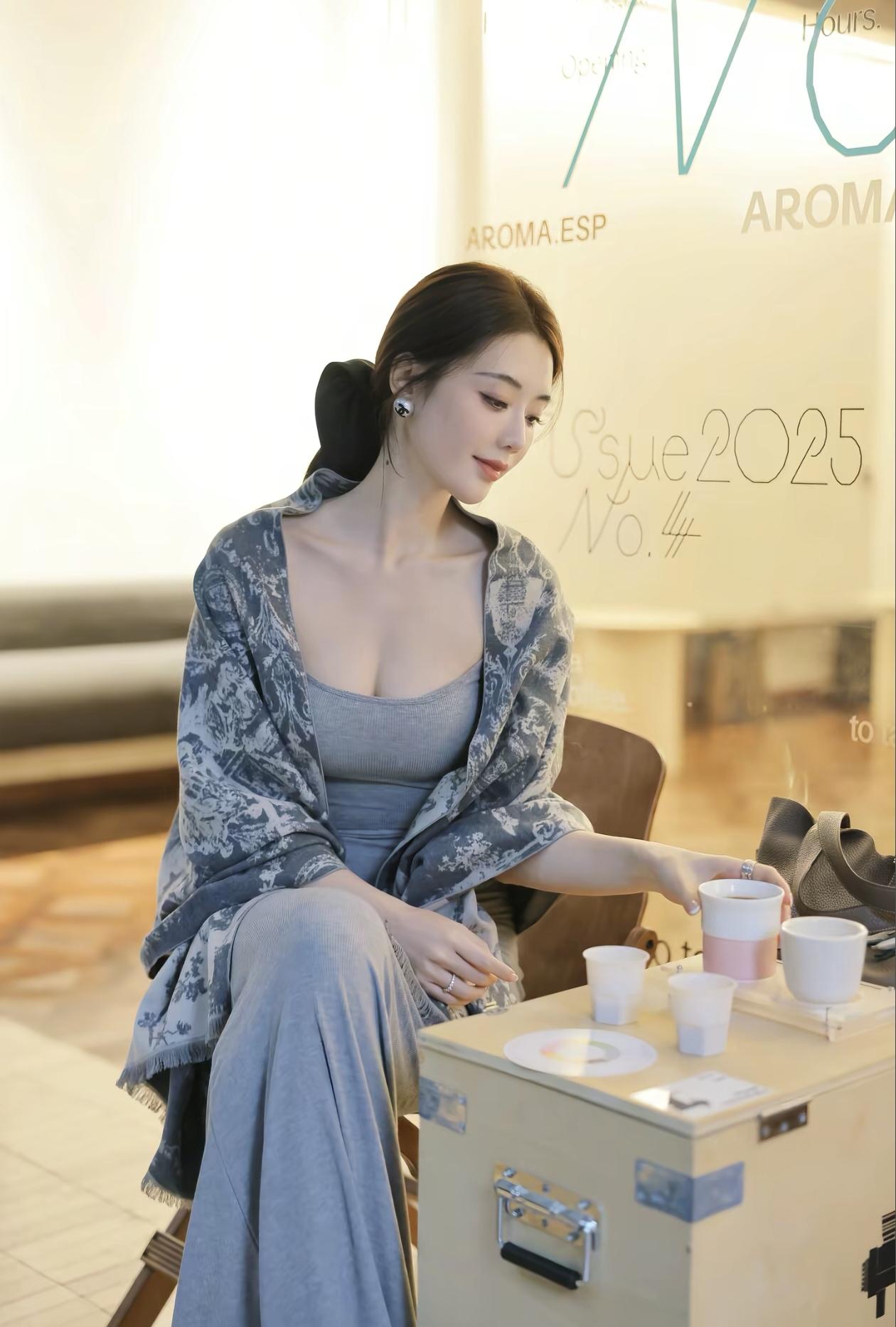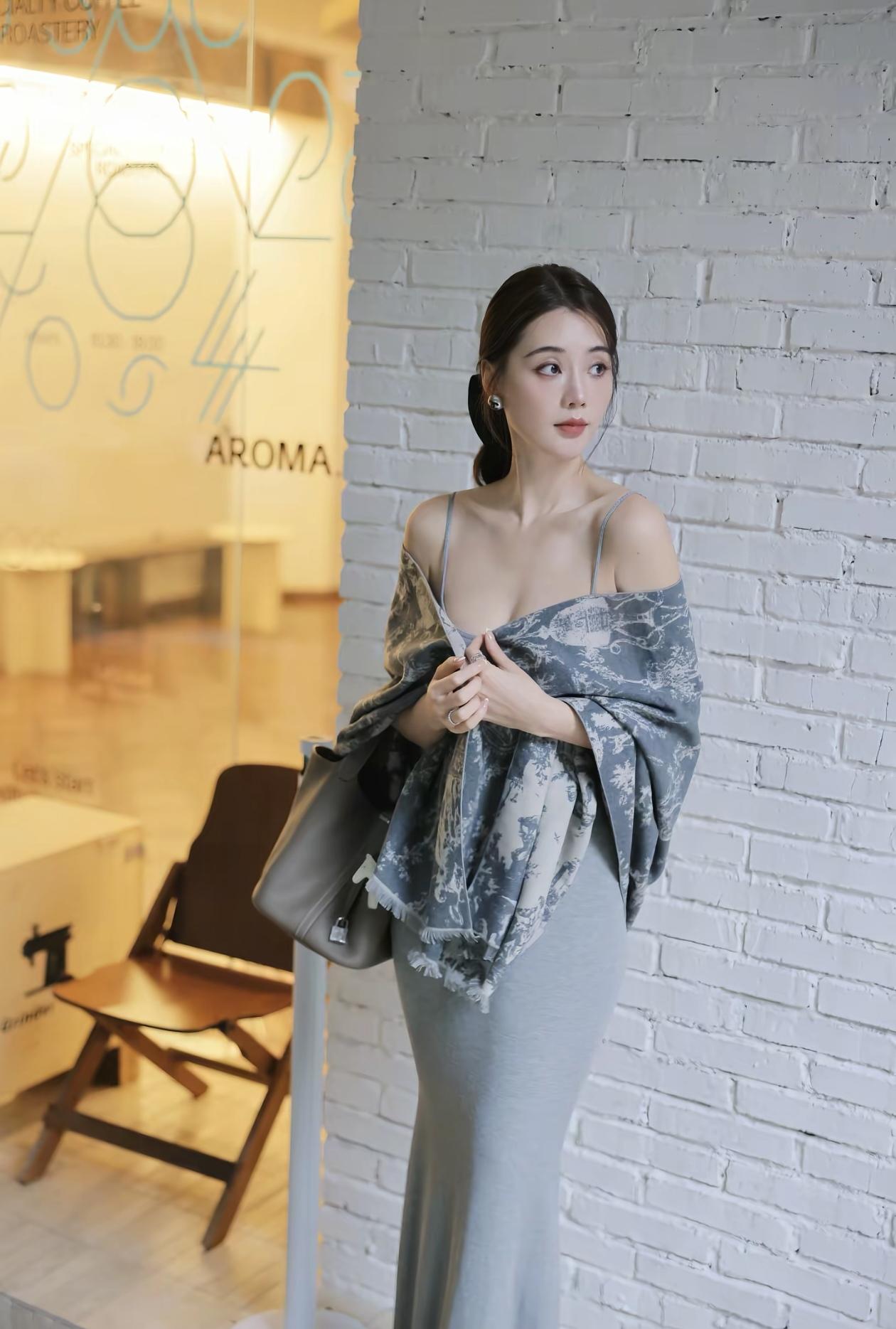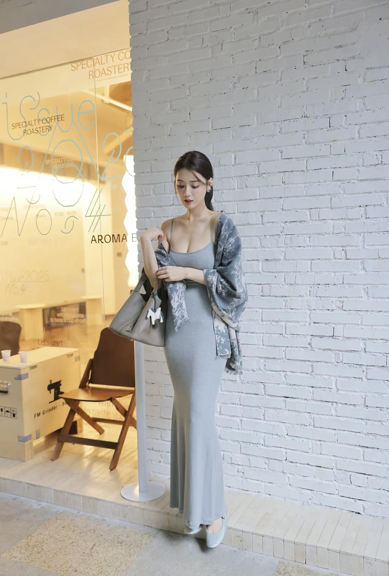 优雅气质穿搭,灰色连衣裙搭配印花披肩,咖啡馆里的时尚瞬间。
