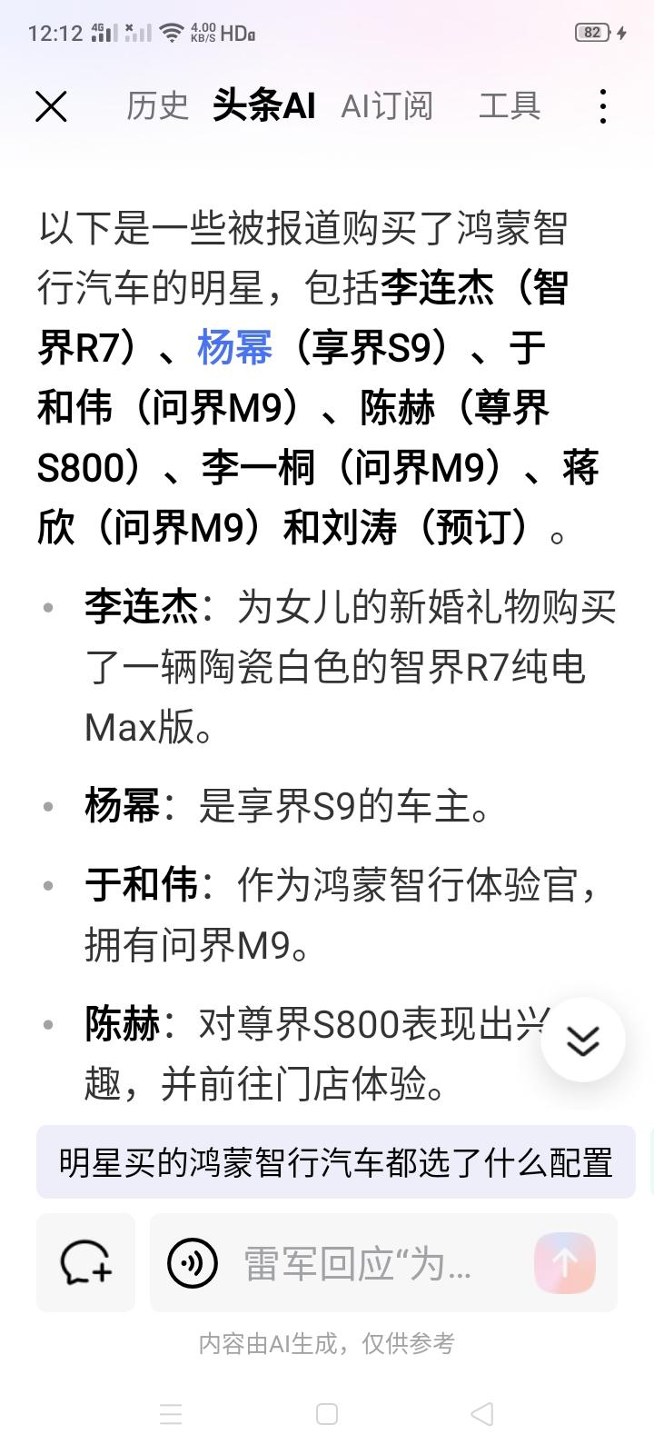 陈赫既是小米su7车主,也是尊界S800车主,明星拥有几辆bba豪车不奇怪,但现在很多明星开始追捧国产新能源车了,尤其是鸿蒙智行旗下的S800和问界M9在明星和富人圈很流行,也许不出10年中国的新能源车、中国的智能驾驶技术真能把一众bba干爬下。