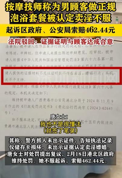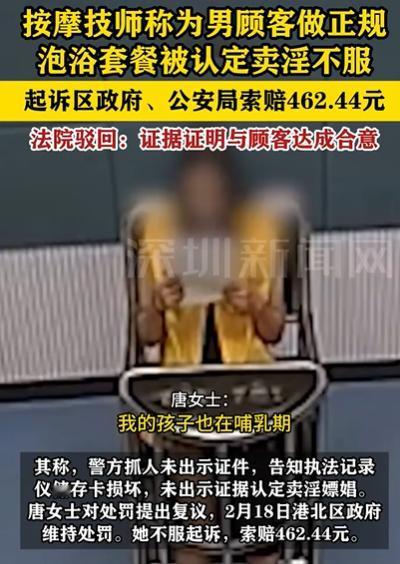 冤不冤?”广西贵港,哺乳期女技师为男顾客做泡浴按摩,结果,刚把水放好,民警就闯入房间,将其与男顾客带走,而后以嫖娼为由拘留了其1天。事后,女技师不服,先是申请复议,未果后,又一纸诉状将区政府及警方告上法庭,但被法院驳回! 女技师委屈不已,将此事反映给媒体,表示要维权到底,其丈夫也替其喊冤。   2024 年 11 月 9 日清晨,广西贵港派出所门口的寒风里,唐女士把冻得发僵的手塞进衣兜。   怀里的保温袋里,装着凌晨挤好的母乳 —— 本该喂给三个月大的小儿子,此刻却陪着她攥着 “嫖娼” 处罚决定书。   拘留一天里,她没合眼,满脑子都是孩子哭着找奶吃的模样,还有民警说 “488 元全裸泡浴” 时的笃定语气。   这个刚出月子就打工的哺乳期妈妈,怎么也想不到,自己只是给顾客放了盆泡浴水,就成了 “违法者”。   时间倒回前一晚 10 点半,唐女士在美容店换好工作服,丈夫发来微信:“孩子乖,等你下班带奶粉回来。”   家里欠着 30 万房贷,大儿子上幼儿园要交学费,小儿子的奶粉钱每月得两千多,她不得不放弃哺乳假出来挣钱。   “198 元的基础泡浴,记得核对项目单。” 店长交代完,就领来三位男顾客,唐女士负责的叶某,看着倒不像难缠的人。   她熟练地往浴缸里放热水,加了点店里标配的浴盐,想着早点做完服务,能赶上最后一班公交回家。   晚上 11 点 15 分,水刚放满,唐女士正弯腰调试水温,房门 “哐当” 一声被撞开。   没等她抬头,就见一名便衣男子冲进来,反手给叶某戴上手铐,金属碰撞声在安静的房间里格外刺耳。   “警察,涉嫌嫖娼,跟我们走!” 男子亮了下证件,快得让唐女士没看清内容,就被推着往外走。   她慌得抓住门框:“我只是做正规服务,还没开始呢!” 可没人理会,叶某被押着走在前面,头也不敢抬。   到了派出所,唐女士第一次听到 “488 元全裸泡浴” 的说法,当场就急得哭了。   “我连 198 元的服务都没开始做,哪来的 488 元?” 她掏出手机想给丈夫打电话,却被民警按住:“配合调查,不然通知你家人来领人。”   一听到 “家人”,唐女士瞬间没了底气 —— 她不敢让公婆知道,更怕影响孩子以后的生活。   民警拿出询问笔录,指着末尾的签字处:“签了字就能早点回家,别耽误事。” 她扫了眼密密麻麻的字,只看清 “配合调查”,就抖着手签了名。   与此同时,家里的丈夫发现妻子没按时回家,打了十几个电话都没人接,只能抱着哭闹的小儿子,坐在门口等。   直到凌晨 2 点,派出所打来电话,说唐女士 “涉嫌嫖娼被拘留”,他以为自己听错了:“不可能!她每天下班都准时回家喂奶,怎么会做那种事?”   第二天一早,他没去上班,抱着孩子守在派出所门口,看到唐女士出来时,眼眶通红,怀里还揣着母乳,瞬间就红了眼。   “咱上诉,肯定是弄错了!” 他接过妻子手里的处罚决定书,指关节攥得发白。   随后,唐女士没去上班,她一边掉眼泪,一边整理材料:美容店的服务价目表、198 元项目的登记记录,还有丈夫拍的家里账单。   可当她去找同事作证时,对方却躲着不见,只发来微信:“那晚另外两个顾客说有特殊服务,我也没办法。”   顾客叶某更是联系不上,据说被拘留后就回了外地,唐女士一下子成了 “孤证”,连店长都劝她:“算了,别惹麻烦。”   她不甘心,找律师咨询,对方说:“关键在执法录像和签字自愿性,可警方说录像丢了,你又没证据证明被胁迫。”   律师费要五千块,相当于她一个月的工资,丈夫咬咬牙:“我去打零工凑,不能让你背着污点过一辈子。”   法院的判决结果,还是驳回诉讼请求 —— 警方对录像丢失的解释 “符合工作实际”,签字笔录被认定有效。   走出法院时,唐女士抱着孩子坐在台阶上,哭了很久,路过的人都忍不住回头看。   “妈妈不哭,” 五岁的大儿子用小手擦她的眼泪,“老师说好人会有好报的。”   这句话让唐女士猛地擦干眼泪,她掏出手机给律师发消息:“我要上诉,就算花光所有积蓄,也要还自己一个清白。 ” 如今,唐女士没再找工作,每天在家照顾孩子,之余就整理上诉材料,丈夫下班后会帮她查法律条文。   保温袋里的母乳早就倒掉了,但她一直留着那个袋子,说要作为 “证据”,提醒自己不能放弃。   2025年,媒体联系她时,她正在给小儿子喂奶,镜头里,孩子的小手紧紧抓着她的衣服,她轻声说:“我不仅是为自己,也是为孩子,要让他们知道,妈妈没做错事。”   当地警方仍未回应录像丢失的争议,而唐女士的上诉材料,已经递交到了中级法院,她在等一个结果,也在等一个给孩子、给家庭的交代。     信源:哺乳期做按摩被认定卖淫?技师不服起诉、索赔462.44元,被法院驳回 2025-11-04 14:43·顶流新闻