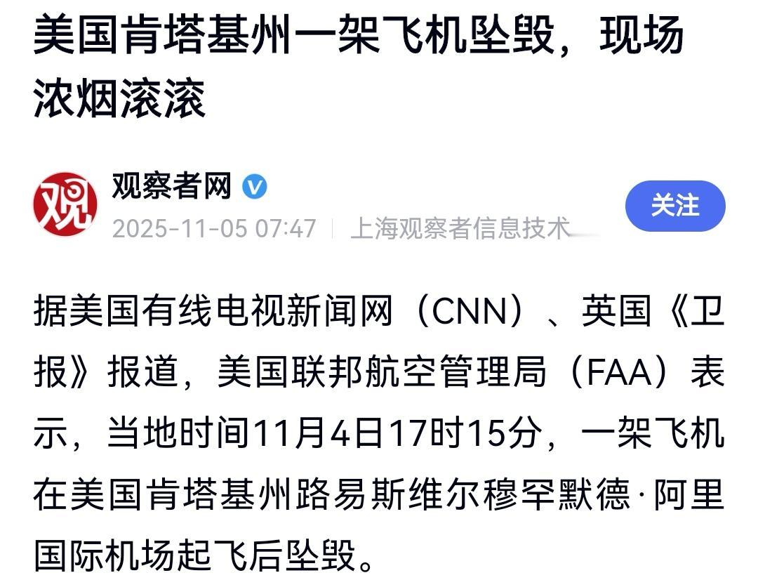 【突发!美一飞机坠毁,有伤亡】 综合信息称,11月4日下午美国一架飞机在本国肯