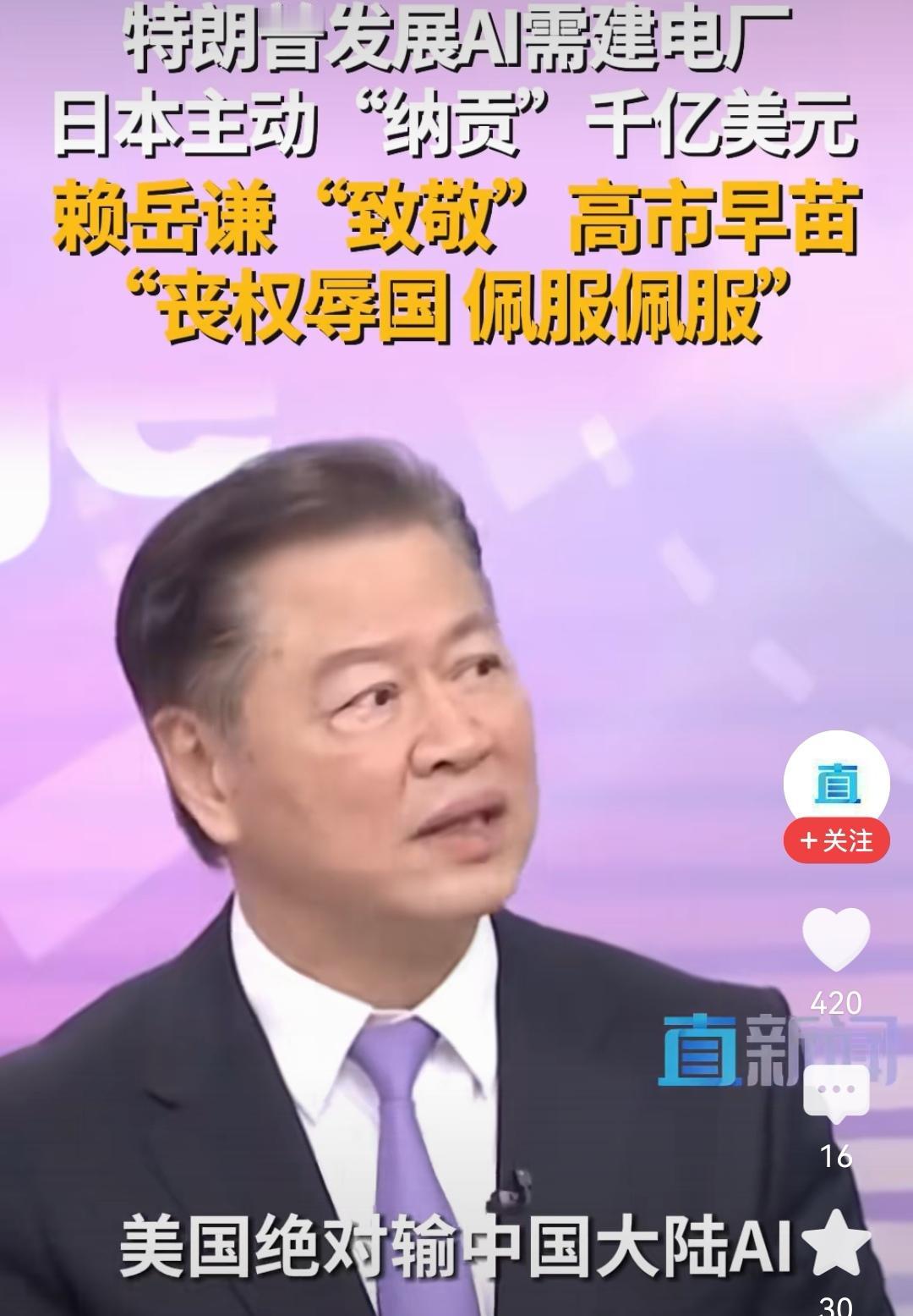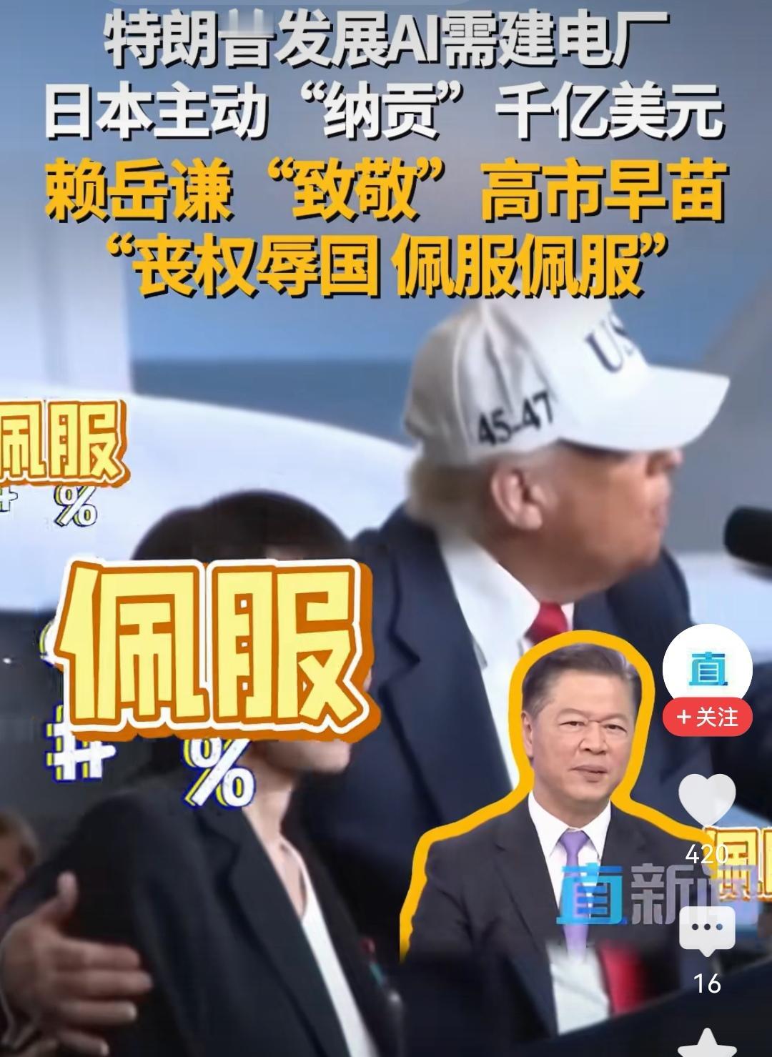 【日本出了“日奸”!台湾名嘴评高市早苗“丧权辱国”】 近日,台湾著名时评员接受记者采访时称,高市早苗为帮助美国发展AI产业,解决电力不足问题,专门为其盖工厂发展核电,将资金无偿投资给美国,帮助美国挣钱,这种行为即搞笑,又无耻。 评论员拱手致敬称,“丧权辱国”啊!佩服佩服! 关于这笔投资的来历是前几日,特朗普访问日本期间,高市早苗“献媚”送上的一份高达5500亿美元的“经济礼包”,主要用途是把资金投向发电厂、输气管道等所谓的“零风险”基础设施项目,预测有超过一半的资金用来帮助美国发展电力与能源产业。 胳膊肘向外拐!抱住美国“大腿”,损失本国利益,无偿输送资本给美国,毫无疑问的被日本国民称为“日奸”。 为达到亲近美国目的,特朗普访问日本期间,无论是言行和举止,高市早苗都表现的“暧昧”无比,看特朗普的眼神都“拉丝”到了无以伦比的地步,特别是在当天会见结束,下楼时还主动挽住特朗普的手臂。当然,特朗普也有回应,在视察部队时主动抱了她的腰,让她兴奋的蹦哒跳了起来。 高市早苗种种行为,引发日本支持她的右翼分子集体“咧嘴”,他们早有判断高市早苗会做出亲美的具体行动,但没想到这么没有底线,批评她的行为失去了分寸,作为一国领导人,谄媚的程度,严重损害了国家的尊严。 同时,日本的一些网友指责高市早苗,为了博得美国欢心,已然抛弃了所有原则,变成了忠实的奴仆,沦为一个彻头彻尾的卖国贼,全然不顾日本民众的死活,一味地“跪美”“舔美”。 也有网友说她不像一个政治家,更像是服务行业的“妈妈桑”。 无论评论咋样,她毕竟是国民选出来的,除非是当时“没看准”,否则不会坐上这个宝座,说明还是有两把涮子的,在“丧权辱国”的道路上我们祝福她越走越远。