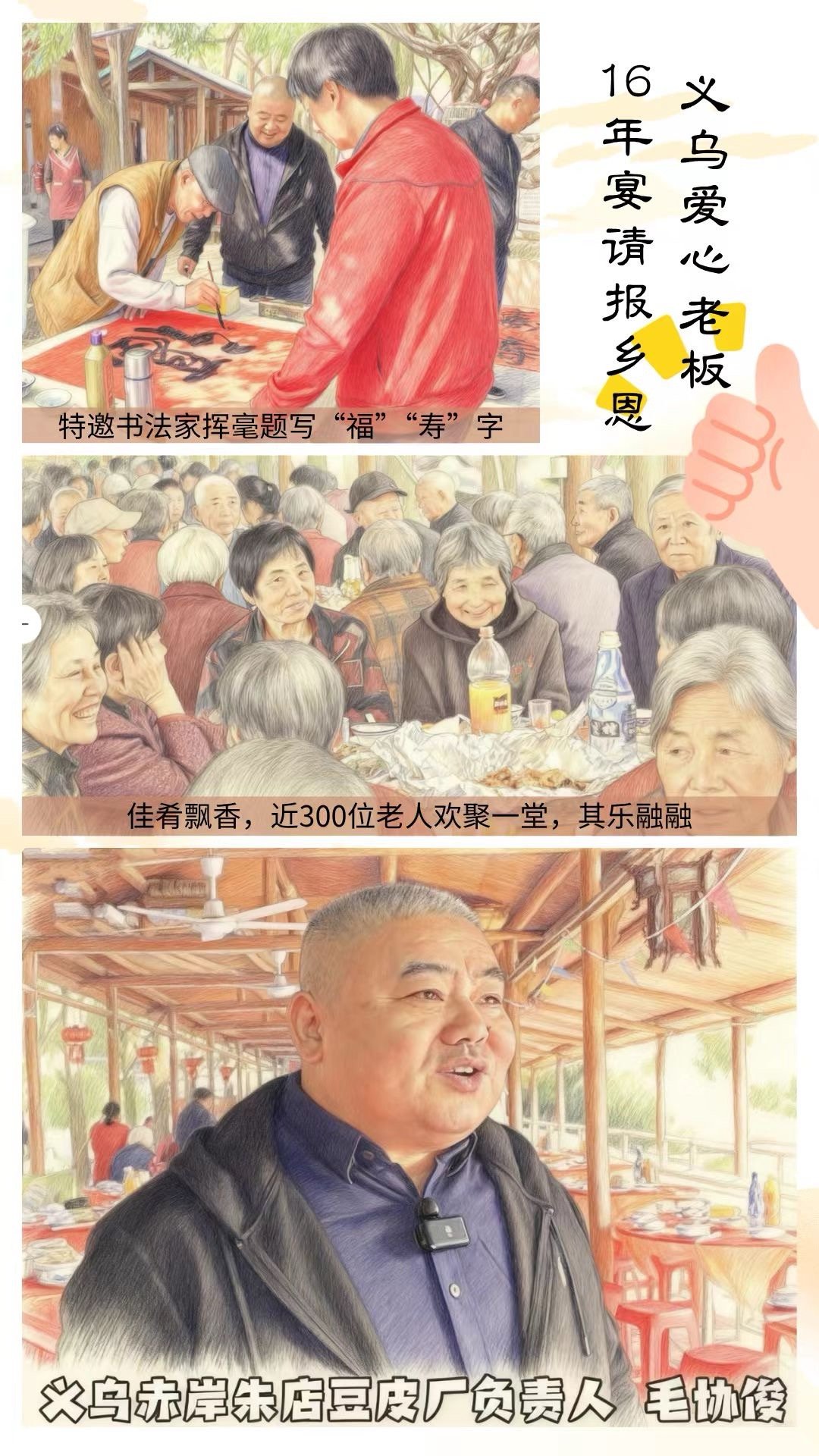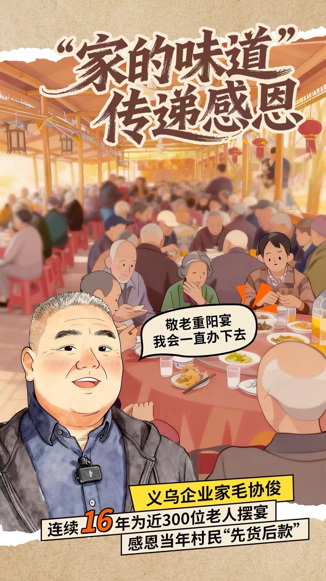 浙江企业家连续16年办宴报乡恩最动人的双向奔赴!义乌村民曾帮创业的毛协俊渡难关,他便连续16年摆下敬老宴。这份跨越时光的感恩,比宴席更暖人心。