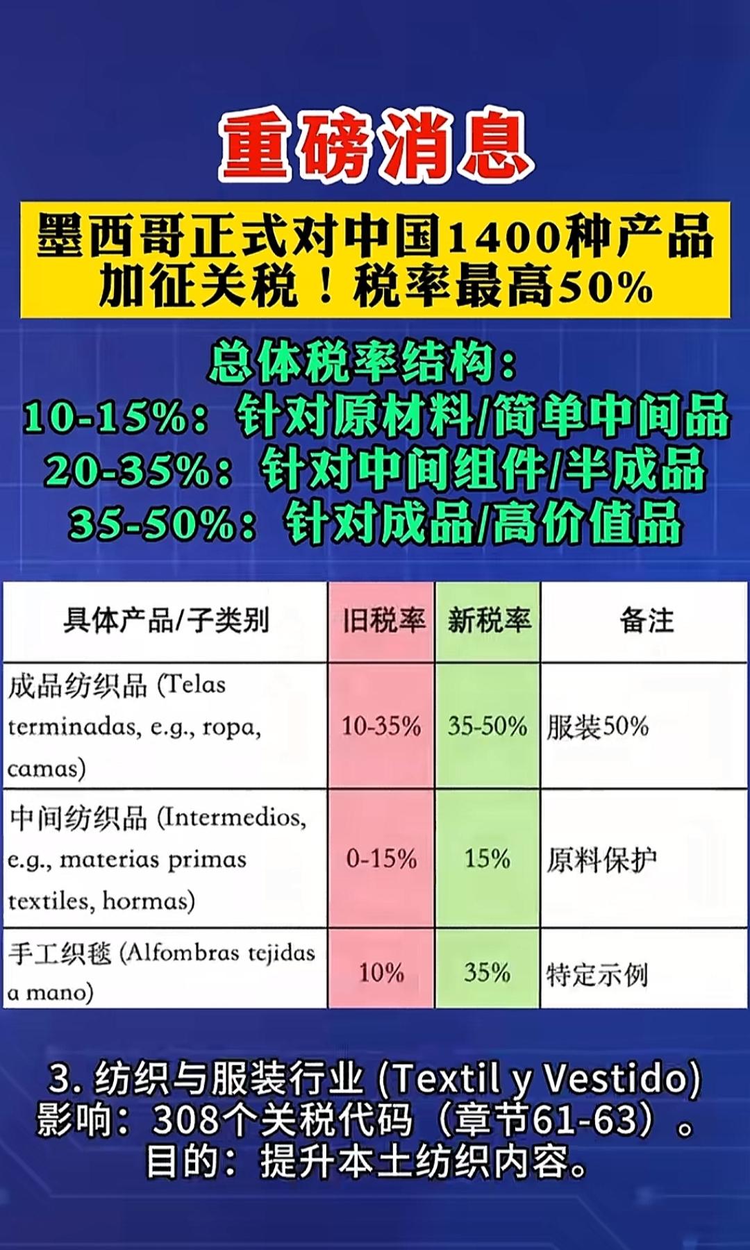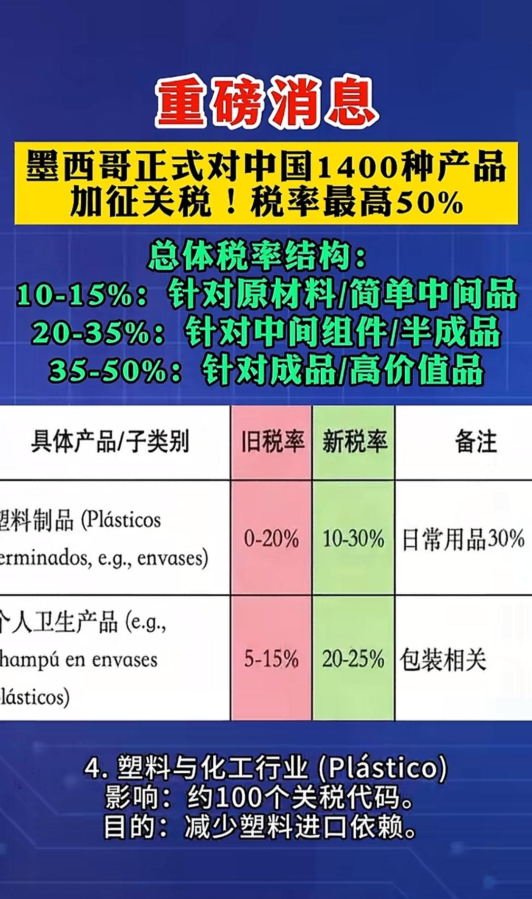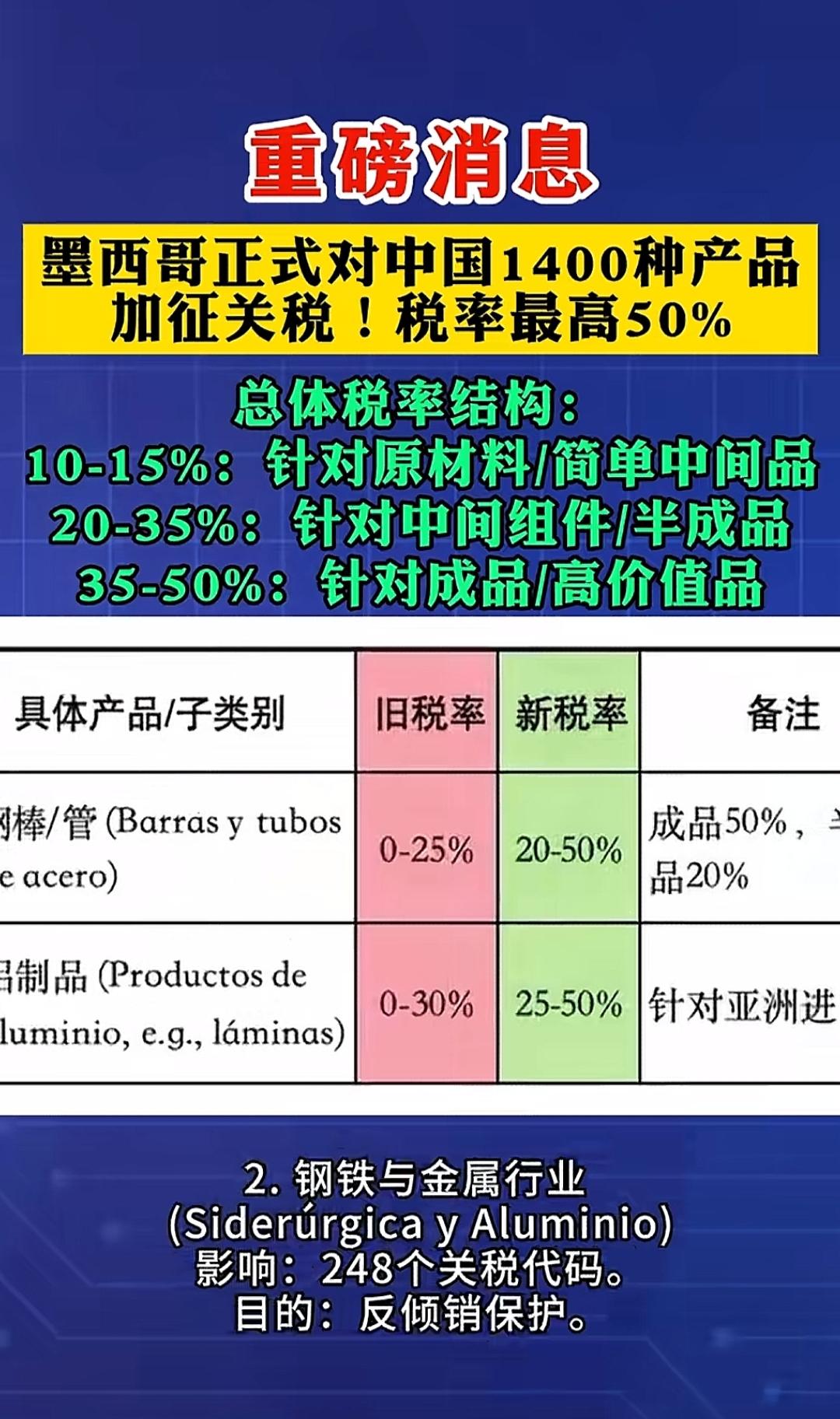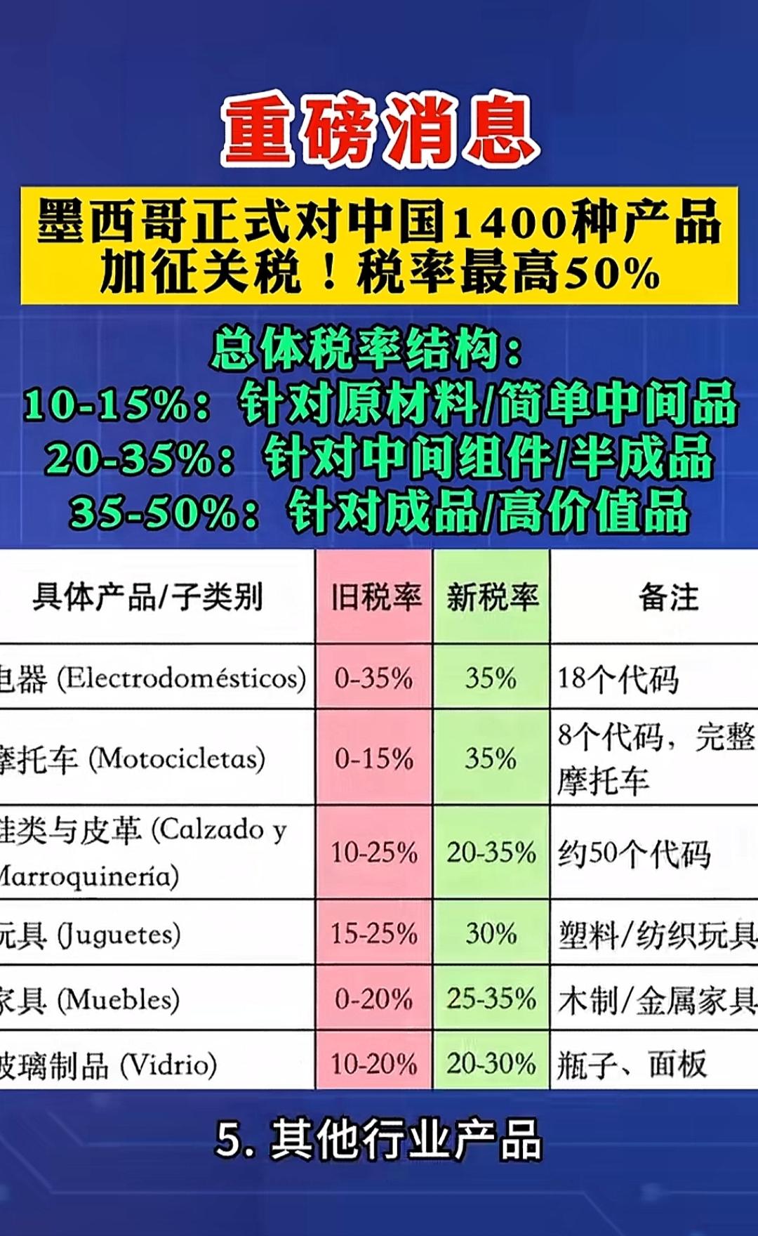 墨西哥参议院10月29日通过对未与其签自由贸易协定国家加征关税的方案,中国1300亿美元的出口额受影响。 中国是墨西哥第二大贸易伙伴,墨西哥是中国北美第二大贸易伙伴,2024年录得中国对墨西哥出口额为1300亿美元,并拥有巨额顺差。参议院通过的加征关税方案并非针对中国,但中国受影响最大。 墨西哥加征关税方案中所涉列物项近1400种,范围广泛;新税率最高为50%,涨幅很大。 美国曾经指责墨西哥被中国利用为中国商品进入美国的跳板,墨西哥加征关税也有这方面的背景原因。