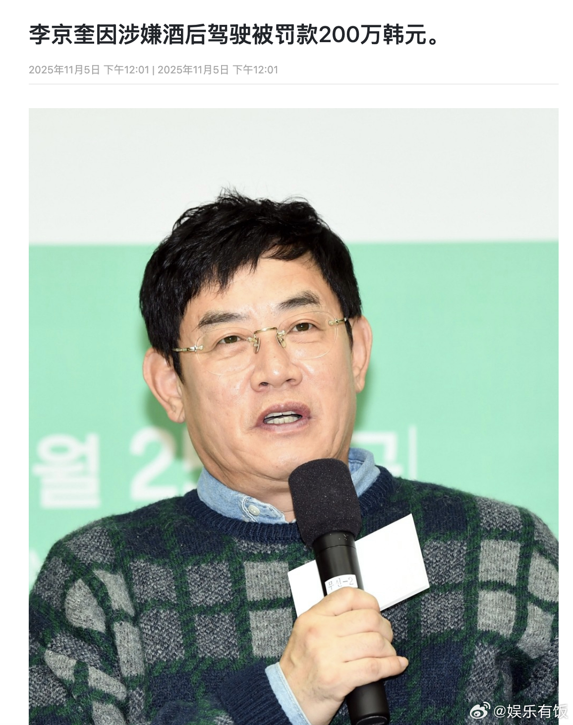 李京奎因涉酒后驾驶被罚200万韩元 据韩媒报道,首尔中央地方法院刑事第八庭法官李英林于10月31 日对李京奎下达简易判决,因其违反道路交通法处以 200 万韩元罚款。