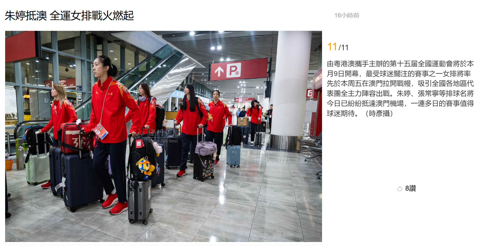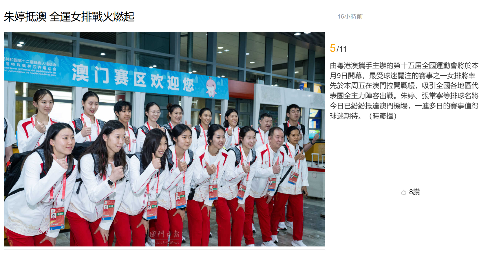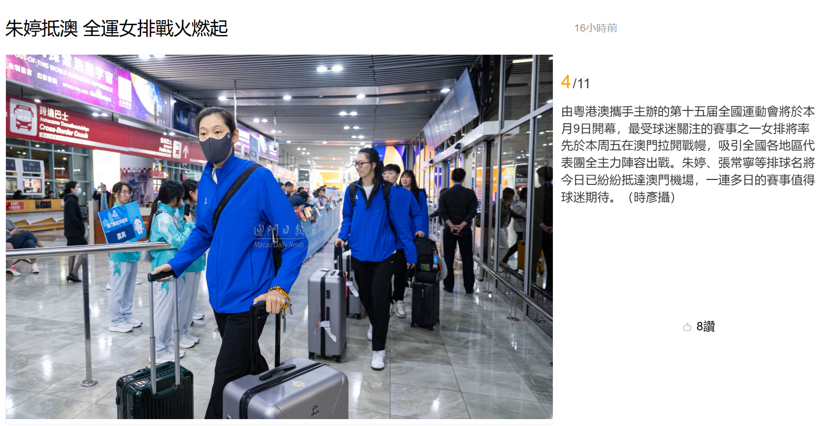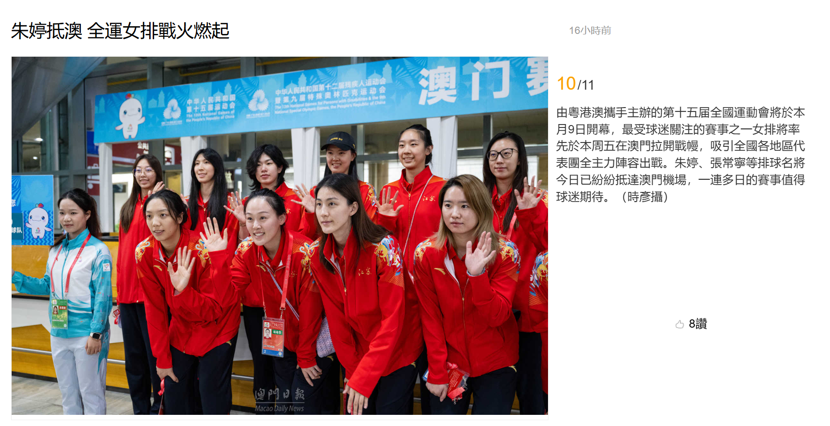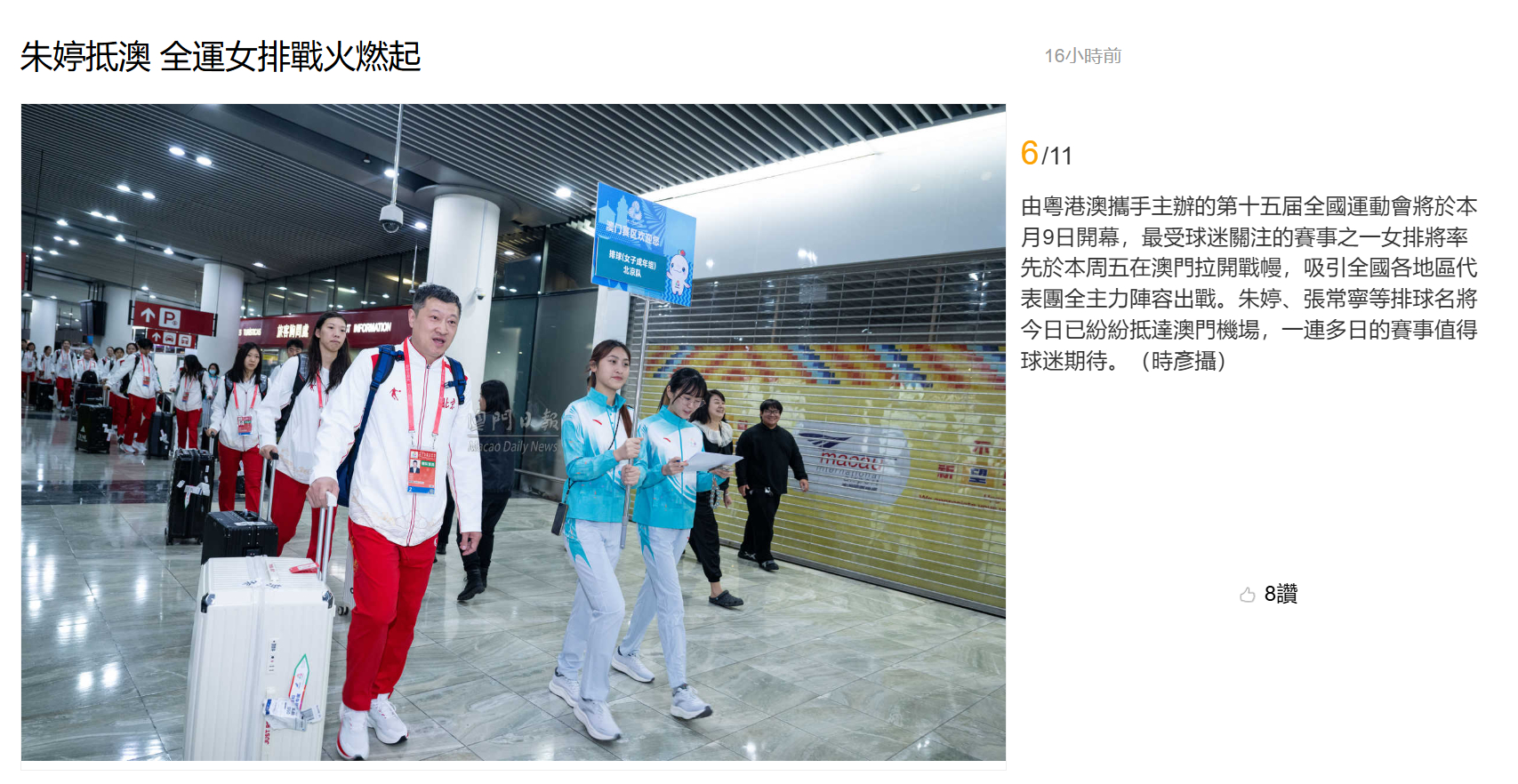 【澳门日报新闻】朱婷抵澳 全运女排战火燃起