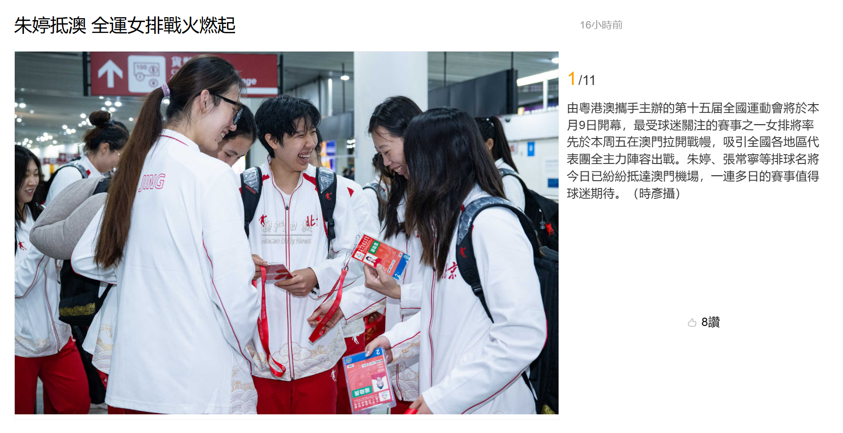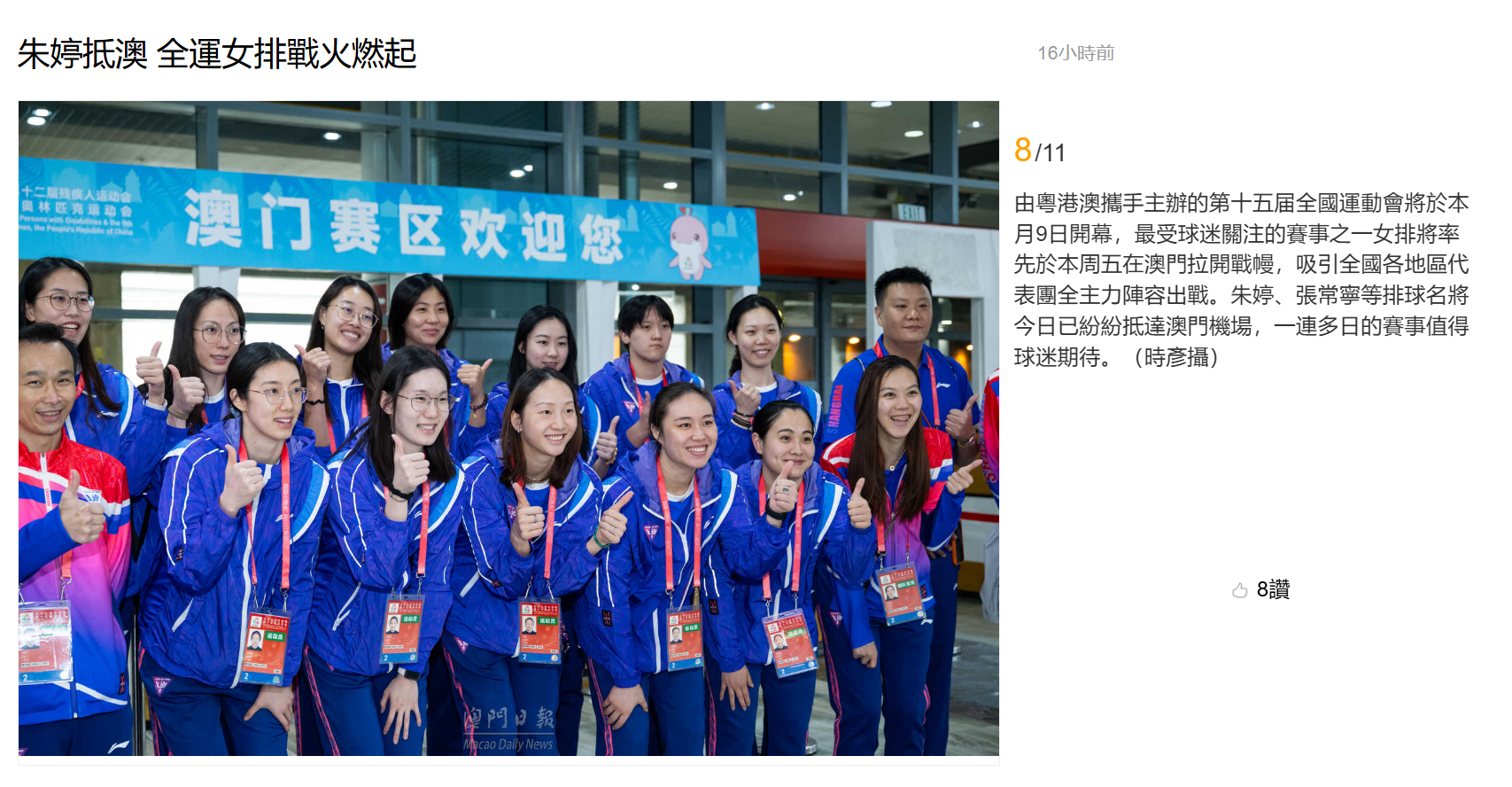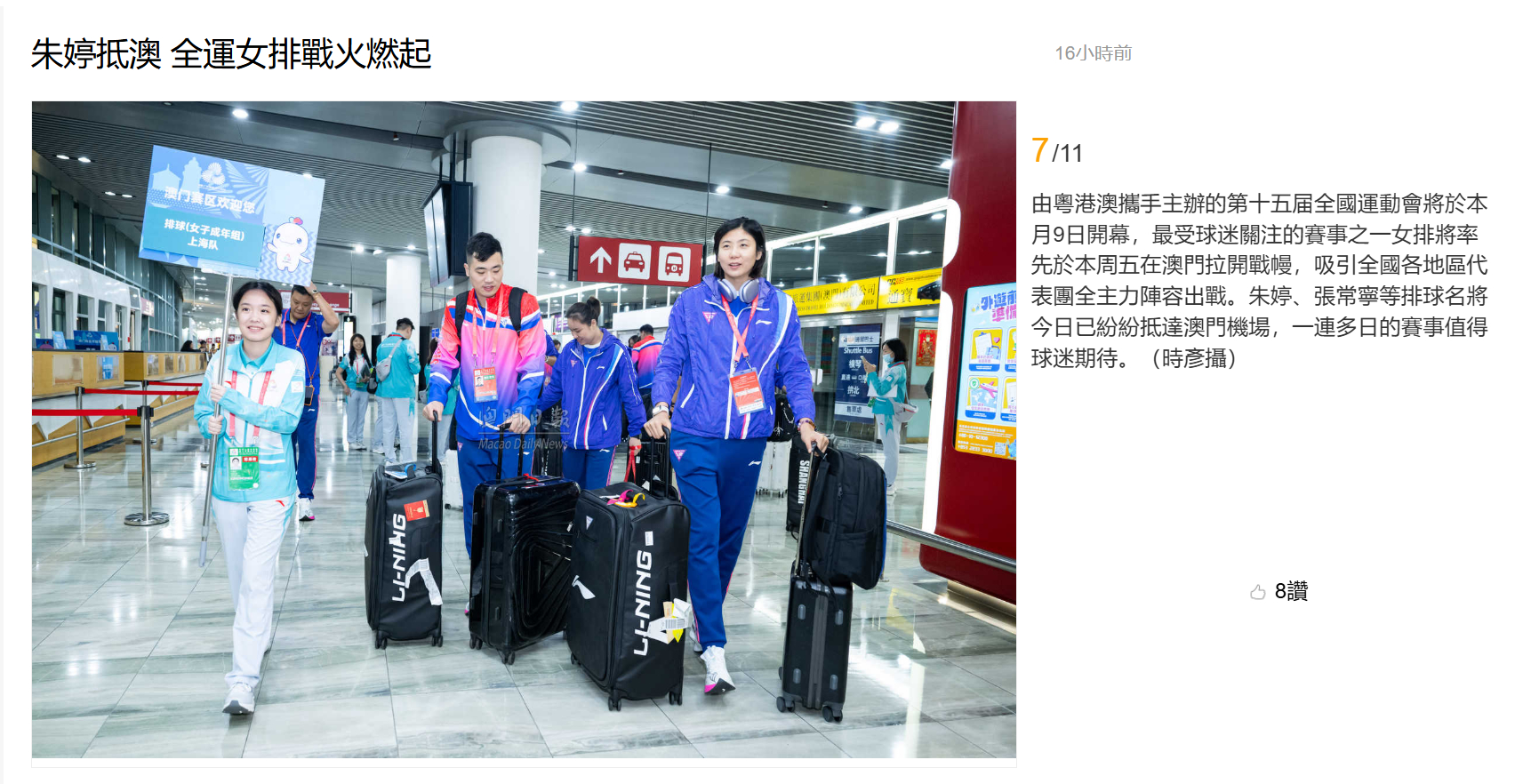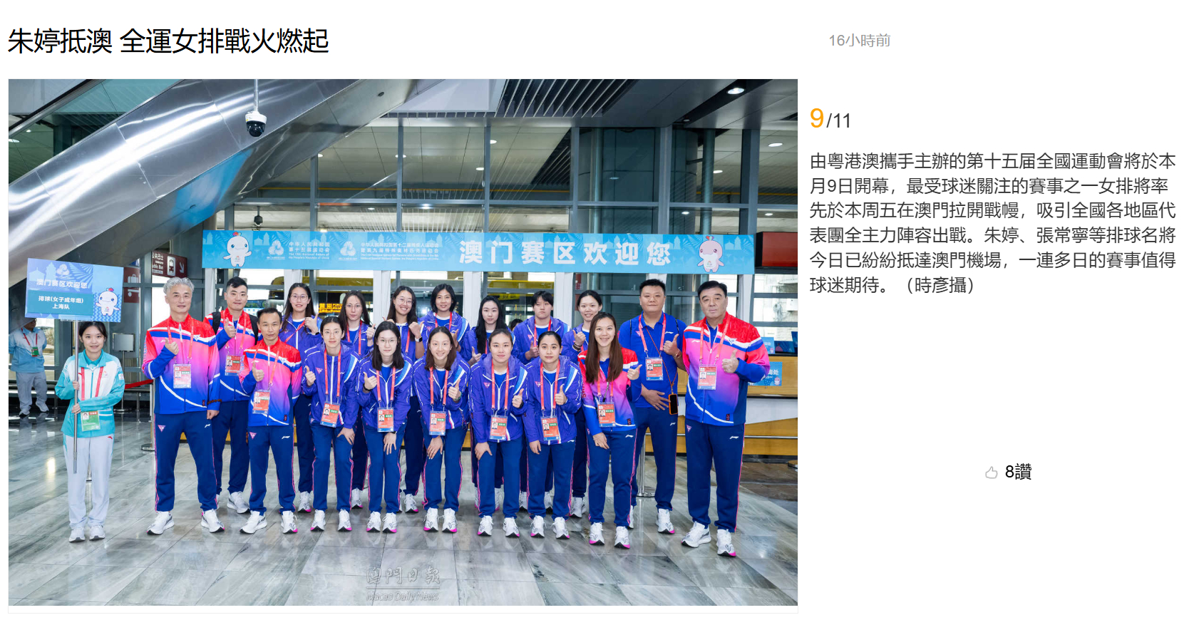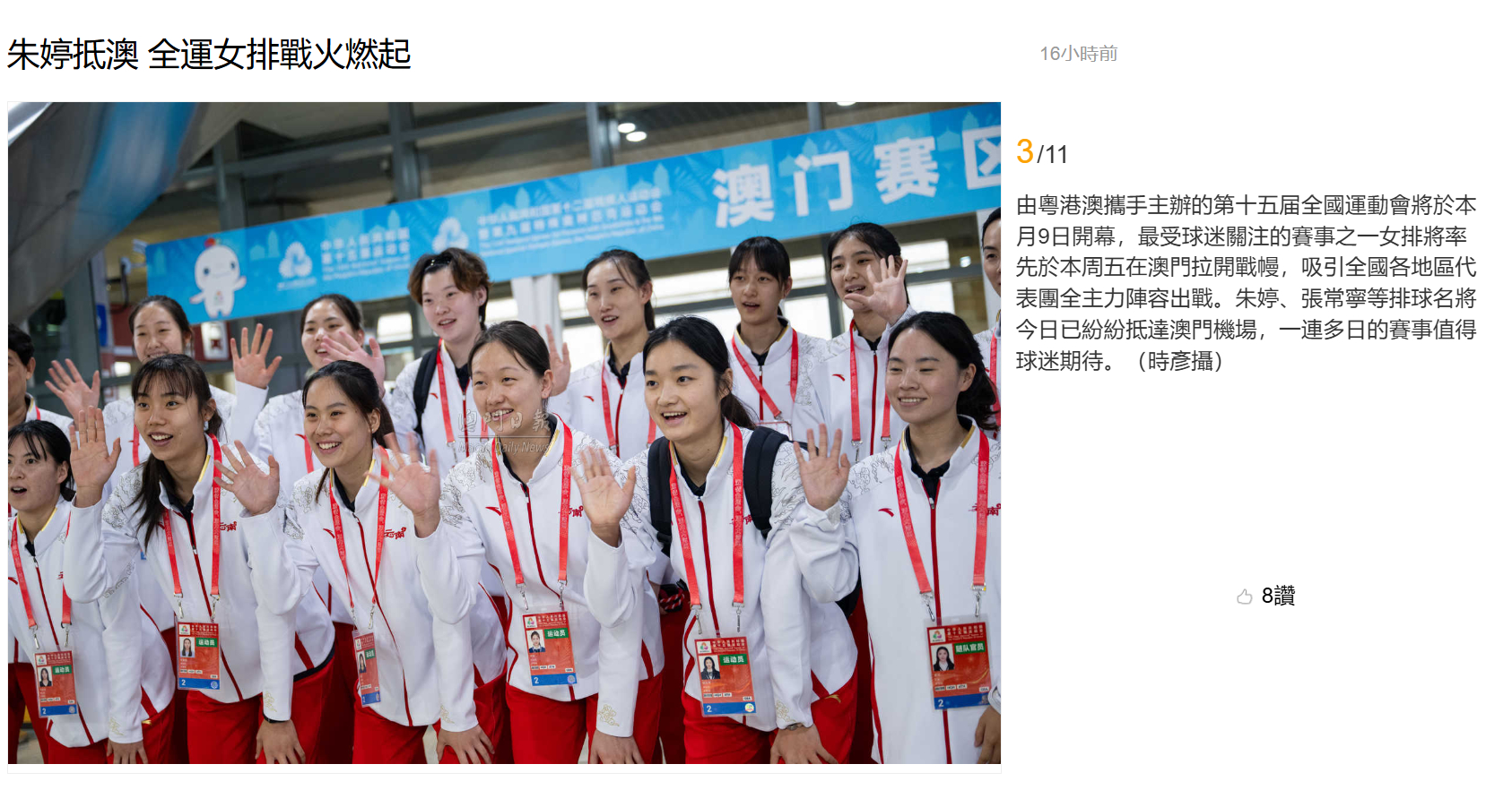 【澳门日报新闻】朱婷抵澳 全运女排战火燃起
