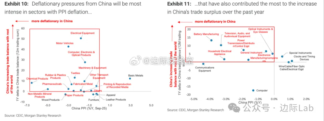 中国国内的价格下行压力与特定行业的贸易顺差扩张之间存在直接关联。数据显示,凡是国内生产者价格指数(PPI)呈现显著通缩的行业,例如电气设备、汽车、计算机及电子产品、电池制造等,其在全球范围内的贸易顺差也录得了最大幅度的增长。这一现象清晰地揭示了中国正在通过贸易渠道,将内部的通缩压力向外输出,而这些价格持续走低的行业,正是驱动中国整体贸易顺差扩大的核心引擎。