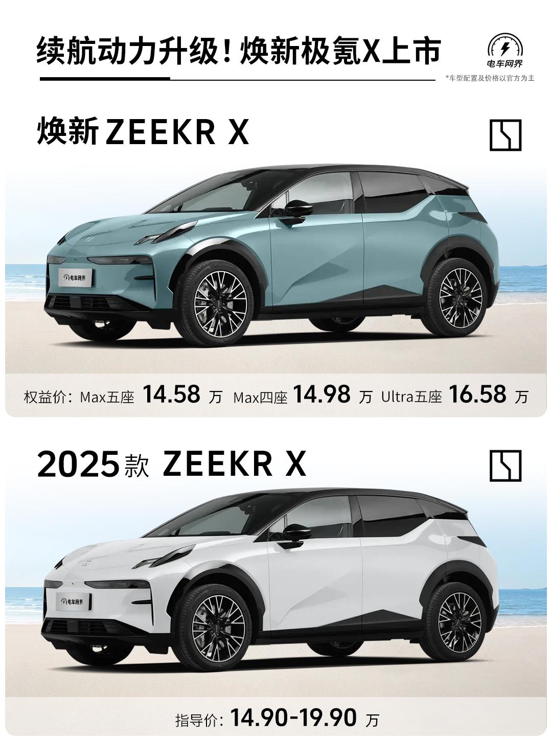 焕新极氪X来啦!跟2025款比起来,动力、电池、内饰、配置都有所升级,下面咱给你讲讲都有哪些变化: 先看外观,多了个“西雅图绿”的哑光车漆,更有个性了~整体还是那个熟悉的帅气造型,无边框车门、隐藏式门把手这些元素都还在。 内饰变化很实用: 储物空间更合理了,之前被大家吐槽的“灵动出风口”终于取消,换回了实用的水杯架!门板和座椅加了菱纹缝线,车顶也用上了第二代Microfiber超纤绒,摸起来、看起来都更有质感。 科技配置更加丰富: 包括14.6英寸电动滑移智慧屏、智能感应无框自动门、新一代LV调光天幕、智能控温中岛冰箱、后排座椅电动翻折、4D云端零重力座椅(四座版)等。 动力部分升级挺猛: 后驱版电机从200kW提到250kW;四驱版综合功率达到365kW(老款315kW),零百加速只要3.69秒,爽就一个字! 电池和续航也进步明显: 入门版用的是61.47kWh的“金砖电池”,CLTC续航直接干到530km(老款420km),还支持4.5C快充,10%充到80%只要15分钟,效率超高。 价格限时起步价14.58万起!权益方面送选装基金、轮毂、车漆等权益,价值超过3万;老车主置换还有充电权益或积分补偿方案。 那么你对焕新极氪X的价格满意不?和领克Z20、方程豹钛3比起来,你更喜欢谁呢?【来自懂车帝车友圈】