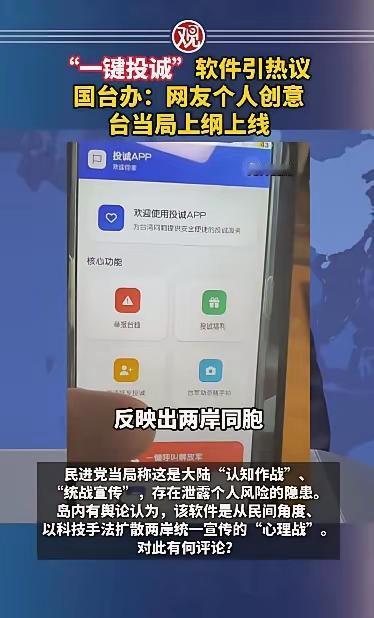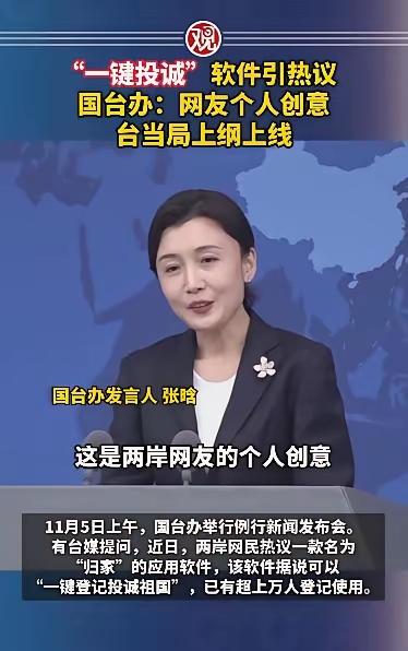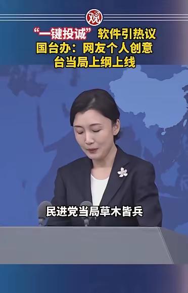 国台办新闻发言人嘴角的笑压都压不住。一键投诚启动,让台湾省被民进党裹挟的同胞有一个很好的出路。 这是两岸同胞的民意。[笑哭] 赶紧把互联网拉新的各种招数都安排上。比如早点加入投诚更享5000积分,介绍加入享双倍积分。大陆旅游景区免费门票,满100送100消费券……完美![笑哭] 统一战役一打响,APP的会员纷纷亮出台湾居民身份证,门前挂上五星红旗,喜迎王师。 顿时就知道幸福生活来得有多快。 点右上角关注我,我们一起去看这个魔幻的世界