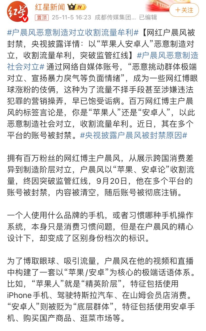 户晨风恶意制造对立收割流量牟利官媒给定性了,户晨风属于恶意制造对立,收割流量牟利。这回大概率是永封了。
