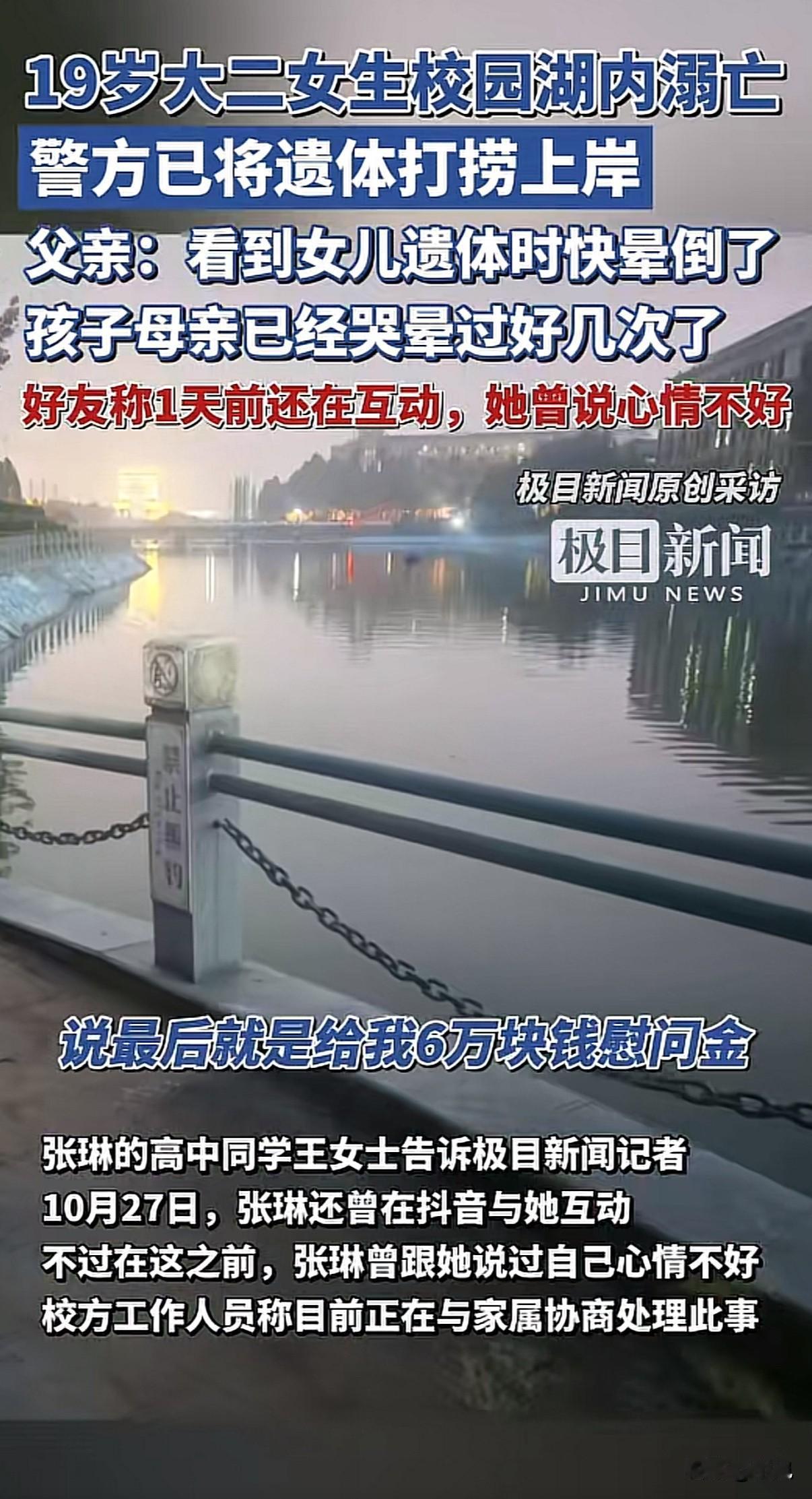 太让人心疼了。郑州一个19岁的大二女生,在校园湖里结束了年轻的生命。花一样的年纪,就这样悄无声息地走了。 事情发生在10月28日。那天凌晨零点,女孩的父亲张先生接到学校电话,说女儿不见了。电话里老师语气急促,只简单告知情况,让家长赶紧到学校。 六个小时后,清晨六点,学校保安在校内湖泊发现异常。等到八点,警方打捞确认,湖里的就是张琳。 校方没有让家长先到学校,而是直接发了个位置——是殡仪馆的位置。父母赶到时,看到的已经是女儿冰冷的遗体。 张先生后来回忆,当时眼前一黑,差点晕倒。孩子母亲承受不住打击,哭晕过去好几次。 这个家庭最后的温暖停留在10月25日晚上。那天,张琳还和父母视频聊天,说着日常琐事,一切如常。谁也没想到,这竟是最后一面。 就连出事前一天,10月27日,张琳还在社交平台和高中同学互动。不过在这之前,她曾向同学透露自己“心情不好”。这四个字,现在听起来格外沉重。 事情过去一周,校方与家属进行了接触。据了解,校方提出给予6万元慰问金,但明确表示“学校不想担责任”。 家属追问了几个关键问题:湖边有没有完善的防护栏?夜间有没有足够的照明?保安是否定期巡逻?对这些具体问题,校方始终没有给出明确答复,只说“正在调查协商”。 目前,警方表示案件详情不便透露。当地殡仪馆已经接收了张琳的遗体,一个年轻的生命就此定格。 从这件事可以看出几个值得关注的问题: 校园内的水域安全需要重视。大学校园里的湖泊、水池,既是景观,也可能成为安全隐患。必要的防护措施、警示标识和监控设备,这些都不能缺少。 学生心理关怀体系需要更完善。当学生说出“心情不好”时,周围有没有人能及时发现?学校有没有畅通的求助渠道?这些问题都值得深思。 学校与家长的沟通方式可以更人性化。让家长直接去殡仪馆认领孩子,这样的处理方式确实欠缺温度。在突发事件的应对上,需要更多对逝者家属的体谅和关怀。 每个年轻生命都值得被温柔以待。希望学校能真正负起责任,把安全措施做到位,把心理关怀落到实处。也希望正处在情绪低谷的年轻人,能及时获得需要的帮助。 期待这件事能有一个公正透明的处理结果,给女孩家人一个交代。更希望这样的悲剧不再发生。