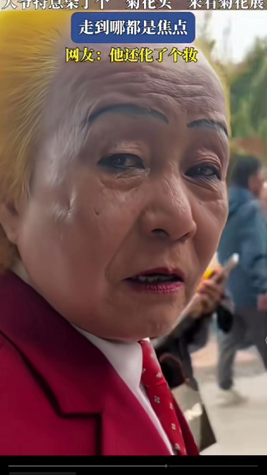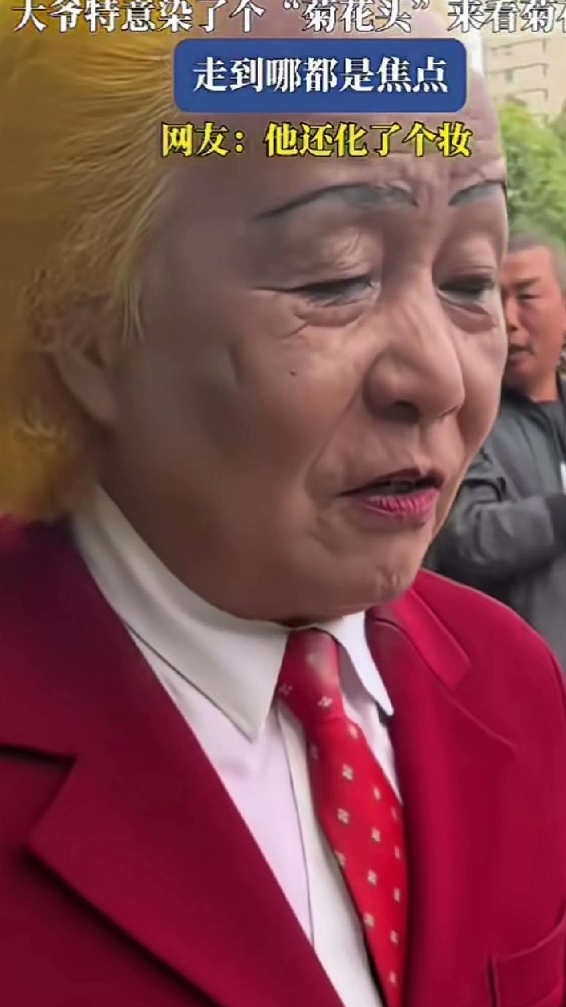 大爷特意染了这个“菊花头”来看菊花展,还特意化了妆,穿了身红西服,走到哪里都是焦点,染个头也就算了,还描眉画眼的把身边的人可看乐了,有人直言大爷的头像菊花,大爷还挺自豪:我就是菊花。 人家大爷穿衣打扮是想和菊花展相符,以表达对菊花的喜爱之情!也没别的意思,只要老人喜欢开心就好,人活的是心态,活出自己想要的样子,只要心情舒畅身体就会健康!其它都是次要的!